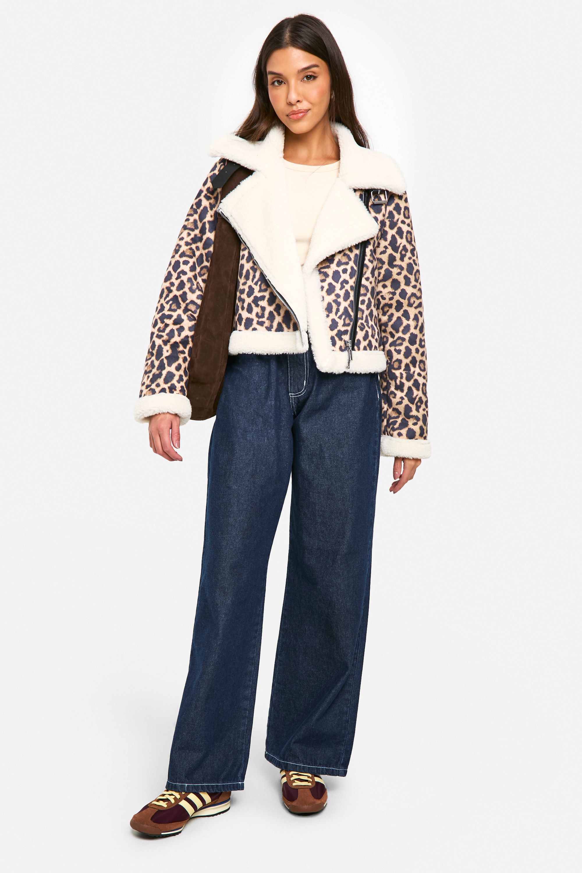- Make a bold statement with this striking leopard print bomber jacket. The cropped silhouette and plush faux fur lining offer both style and comfort, perfect for those chilly autumn days. Pair it with high-waisted jeans and a simple white tee for an effortlessly cool ensemble, or throw it over a midi dress and trainers for a more feminine twist. The asymmetrical zip adds an edgy touch, while the cosy collar keeps you warm and on-trend. Ideal for casual outings, family gatherings, or a night out with friends, this jacket is a versatile piece that will quickly become a go-to in your wardrobe. Its eye-catching design ensures you'll stand out in the crowd, while the faux fur details provide a luxurious feel without compromising on animal-friendly fashion.