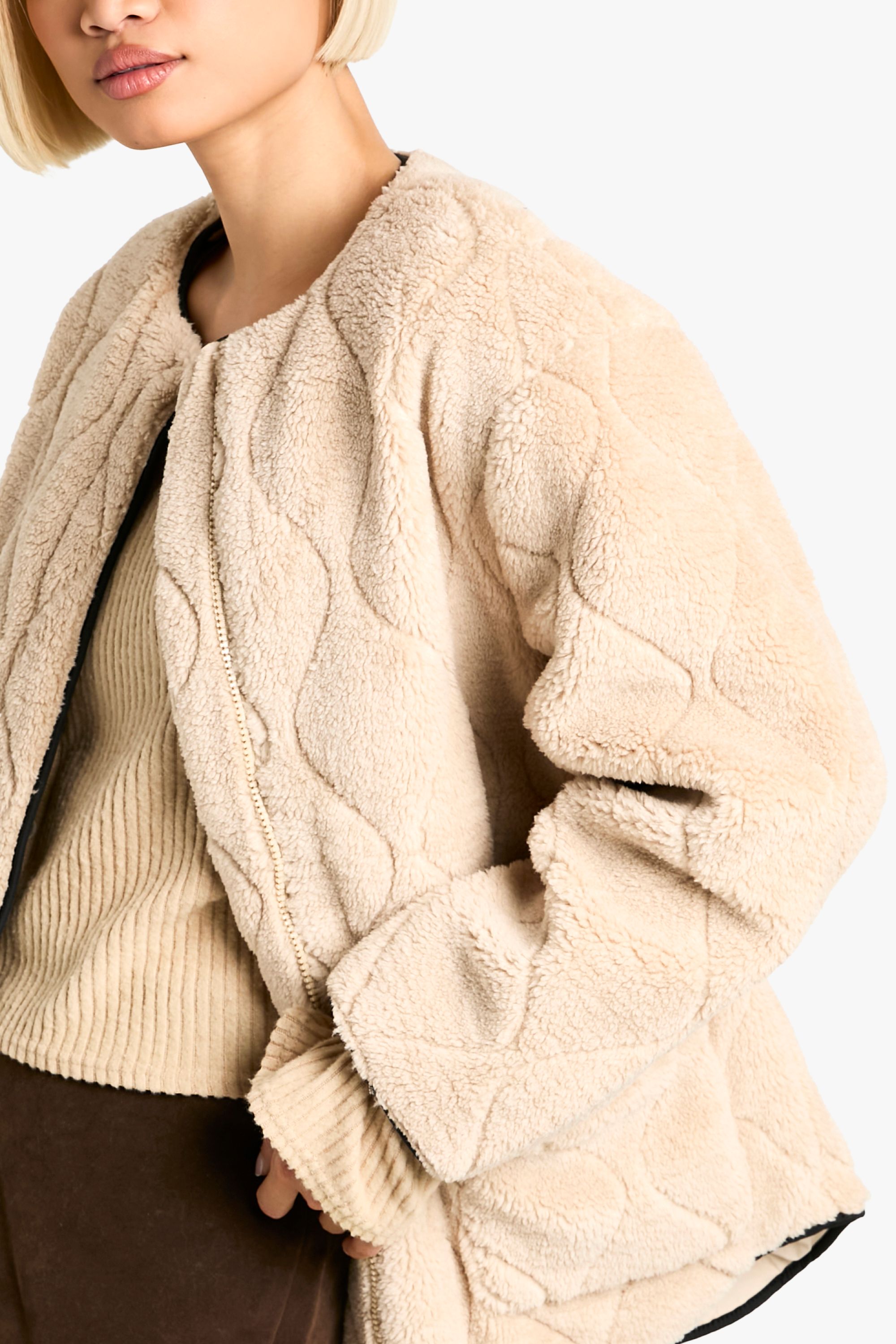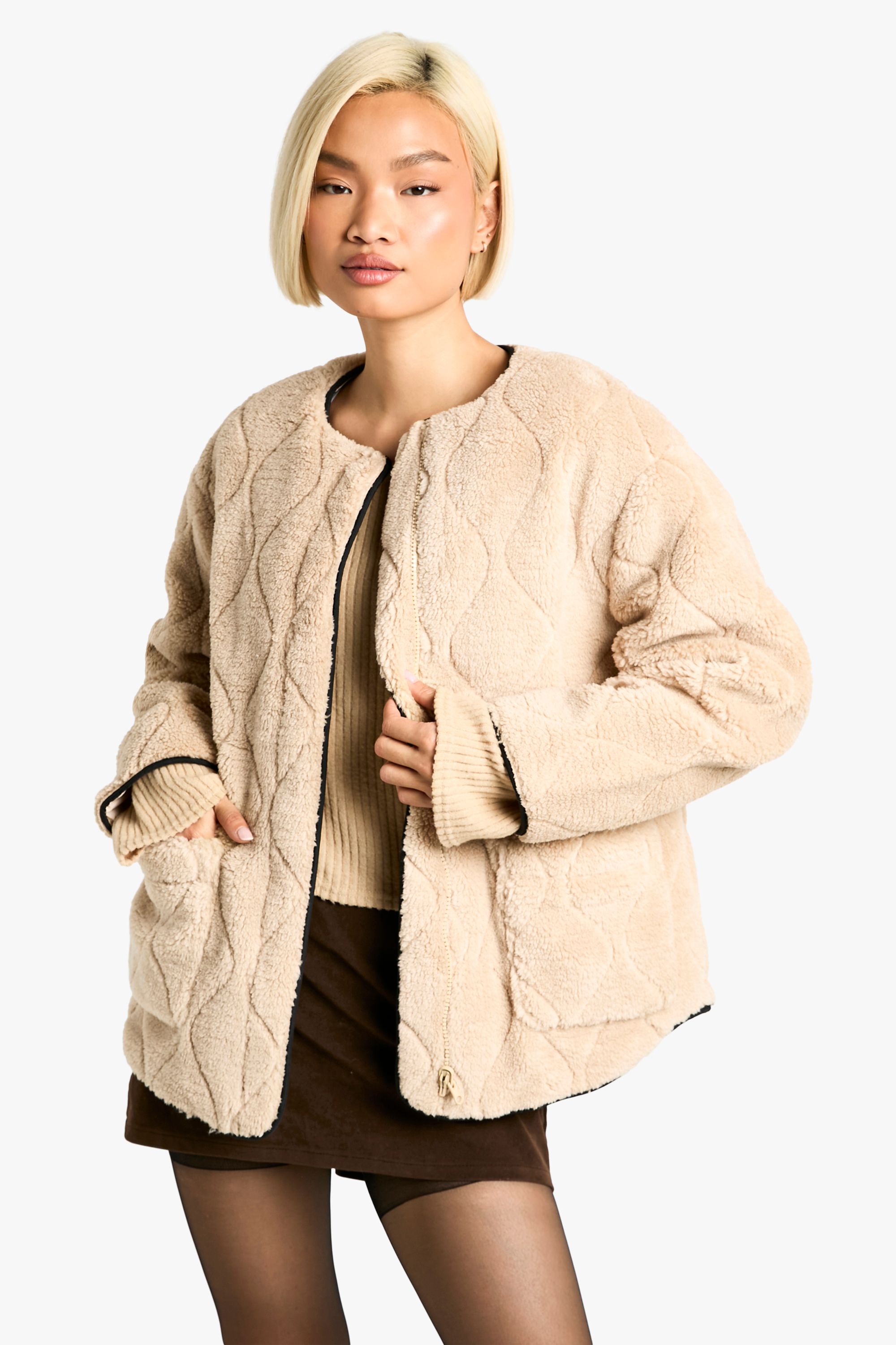 - Embrace the chilly season in style with this eye-catching Onion Quilt Faux Fur Teddy Jacket. The unique quilted design adds a fashionable twist to the classic teddy coat, making it a standout piece for your autumn and winter wardrobe. Perfect for casual outings, this jacket pairs brilliantly with a variety of looks. Try layering it over a chunky knit jumper and mini skirt combo, as seen on our model, for a trendy contrast of textures. Add sheer tights and ankle boots to complete the ensemble. For a more laid-back vibe, throw it on over your favourite jeans and a simple tee. The versatile nature of this jacket makes it ideal for everything from coffee dates to family gatherings. Its oversized silhouette allows for easy layering, ensuring you stay toasty warm without compromising on style. The soft borg fabric promises to keep you snug during those brisk walks in the park or while waiting for the bus on chilly mornings.