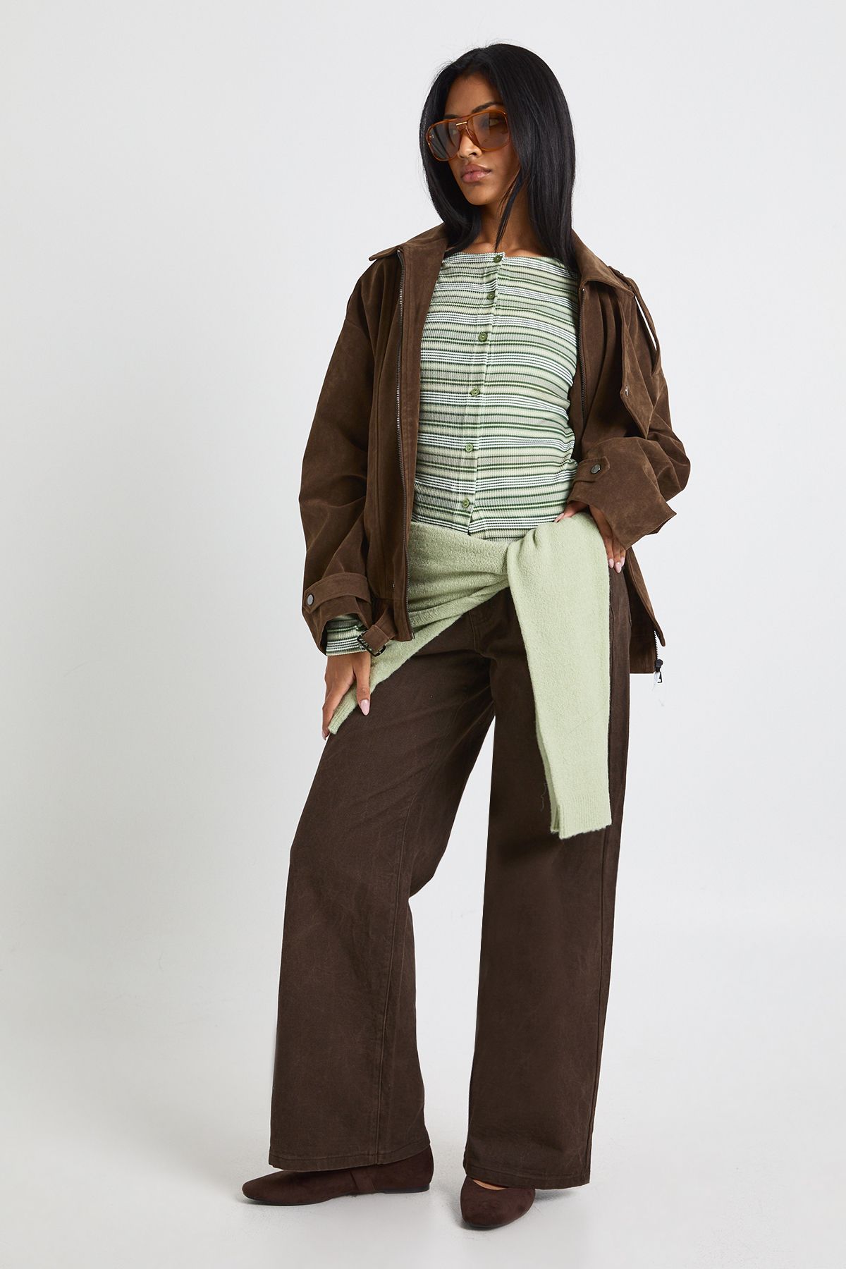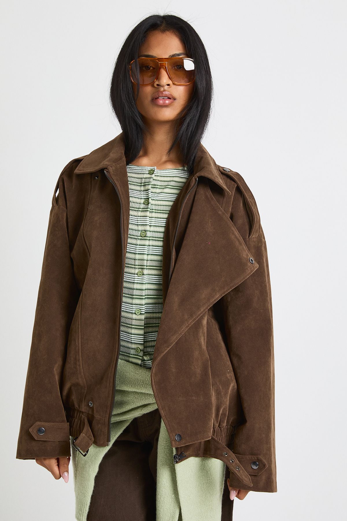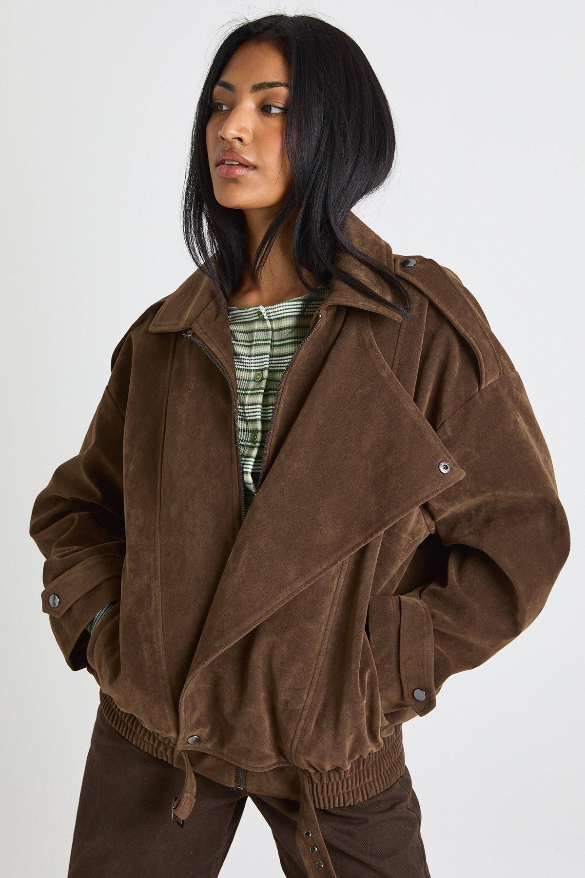• Practical side pockets for everyday functionality Make a bold statement with this oversized faux suede jacket that combines relaxed styling with urban edge. The generous proportions create a fashionable silhouette that works brilliantly layered over both casual and smart-casual ensembles. Style as seen with a striped top and wide-leg trousers for a contemporary daytime look, or throw over a simple tee and jeans combo for instant weekend chic. The versatile design transitions seamlessly from coffee dates to casual gatherings, whilst the textured finish adds interest to your autumn-winter wardrobe. For cooler days, layer over a lightweight jumper and pair with chunky trainers and your favourite crossbody bag. This jacket is a true wardrobe hero that will become your go-to for effortless, on-trend styling throughout the seasons.
