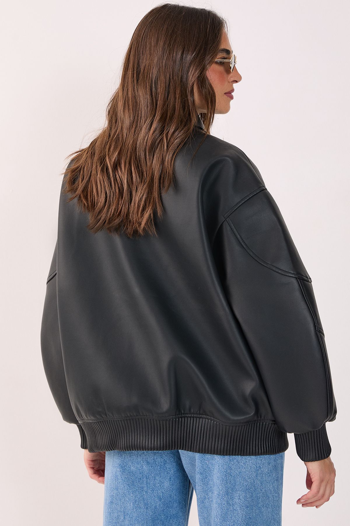 - Make a striking statement with this oversized longline faux leather bomber jacket from NastyGal. The exaggerated proportions create a fashion-forward silhouette that's perfect for layering over your favourite daywear pieces. As seen in the image, pair with a textured mini dress and knee-high boots for an effortlessly cool contrast between structured outerwear and feminine details. This versatile piece works brilliantly for casual coffee dates, weekend shopping trips, or evening drinks with friends. The loose fit allows for comfortable layering over jumpers when temperatures drop, while the structured material maintains its shape for a polished look. Perfect for adding an edgy touch to your autumn and winter wardrobe, this bomber jacket combines practicality with NastyGal's signature bold aesthetic.