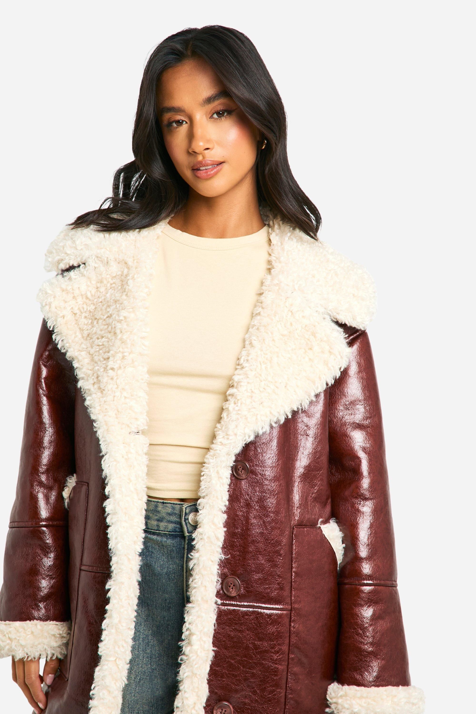 Petite Faux Leather Teddy Trim Longline Aviator Jacket