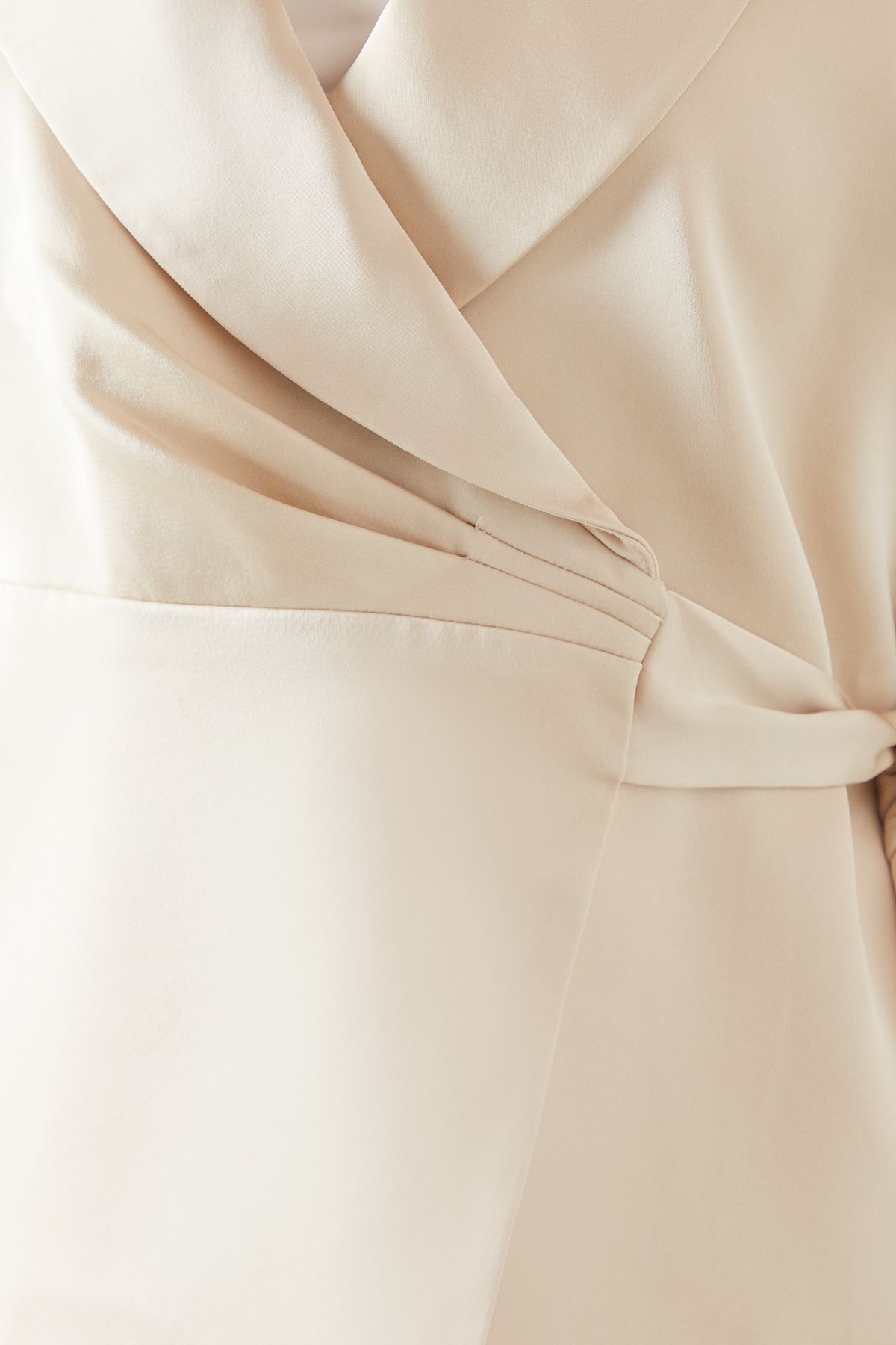 - Fluid satin wrap design for a luxurious drape