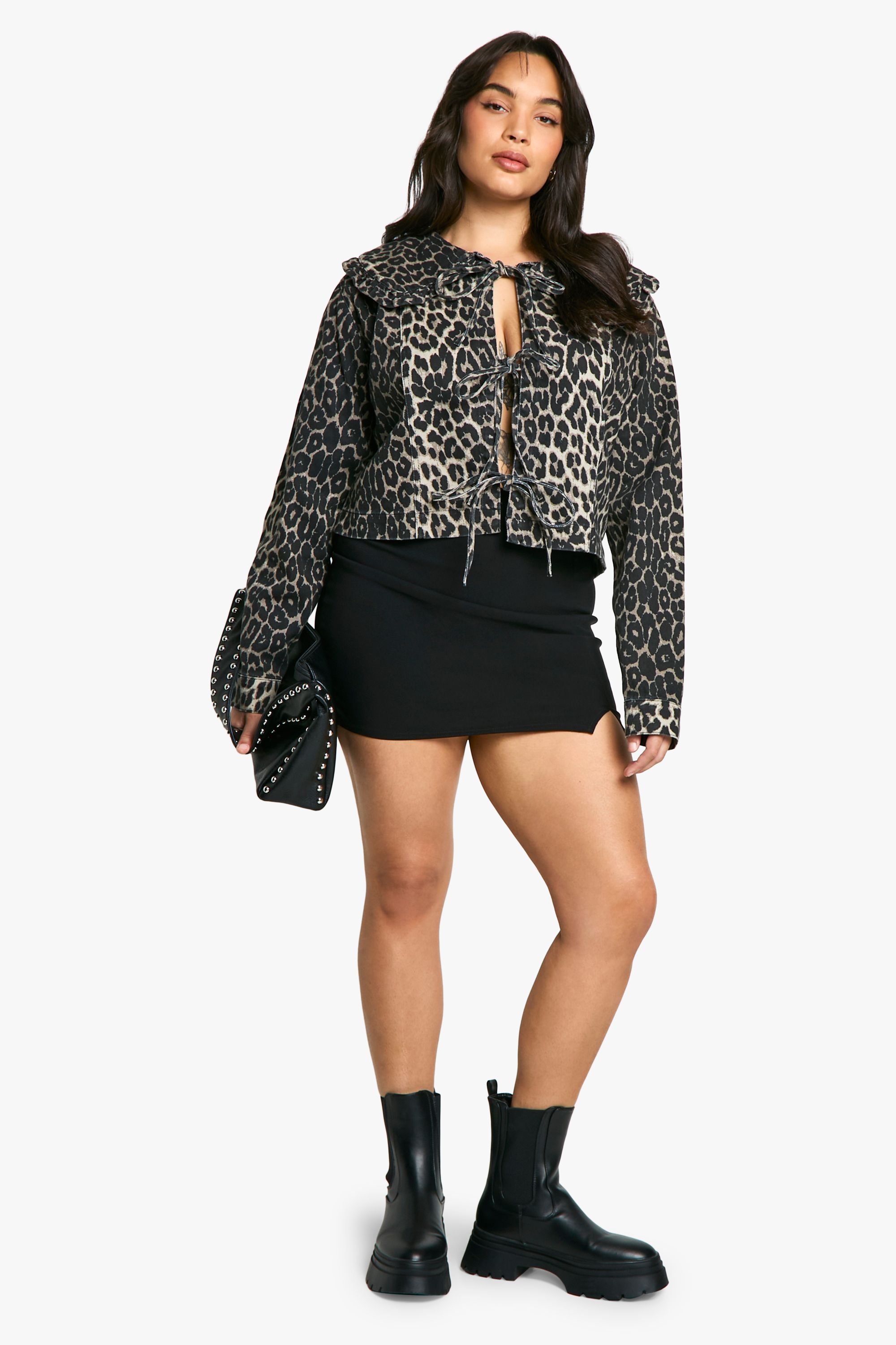 - Make a bold statement with this fierce leopard print denim jacket. The striking pattern combines with a unique collar detail and tie-front closure to create a head-turning piece that's perfect for the fashion-forward woman. The cropped length adds a contemporary touch, ideal for pairing with high-waisted bottoms. Style this jacket with a black mini skirt and chunky boots for an edgy night out look, or throw it over a simple dress for a casual daytime ensemble. The versatile design allows for endless styling possibilities, making it a must-have addition to your wardrobe. Whether you're heading to a family gathering or meeting friends for coffee, this jacket will ensure you stand out from the crowd while maintaining a comfortable and confident vibe.