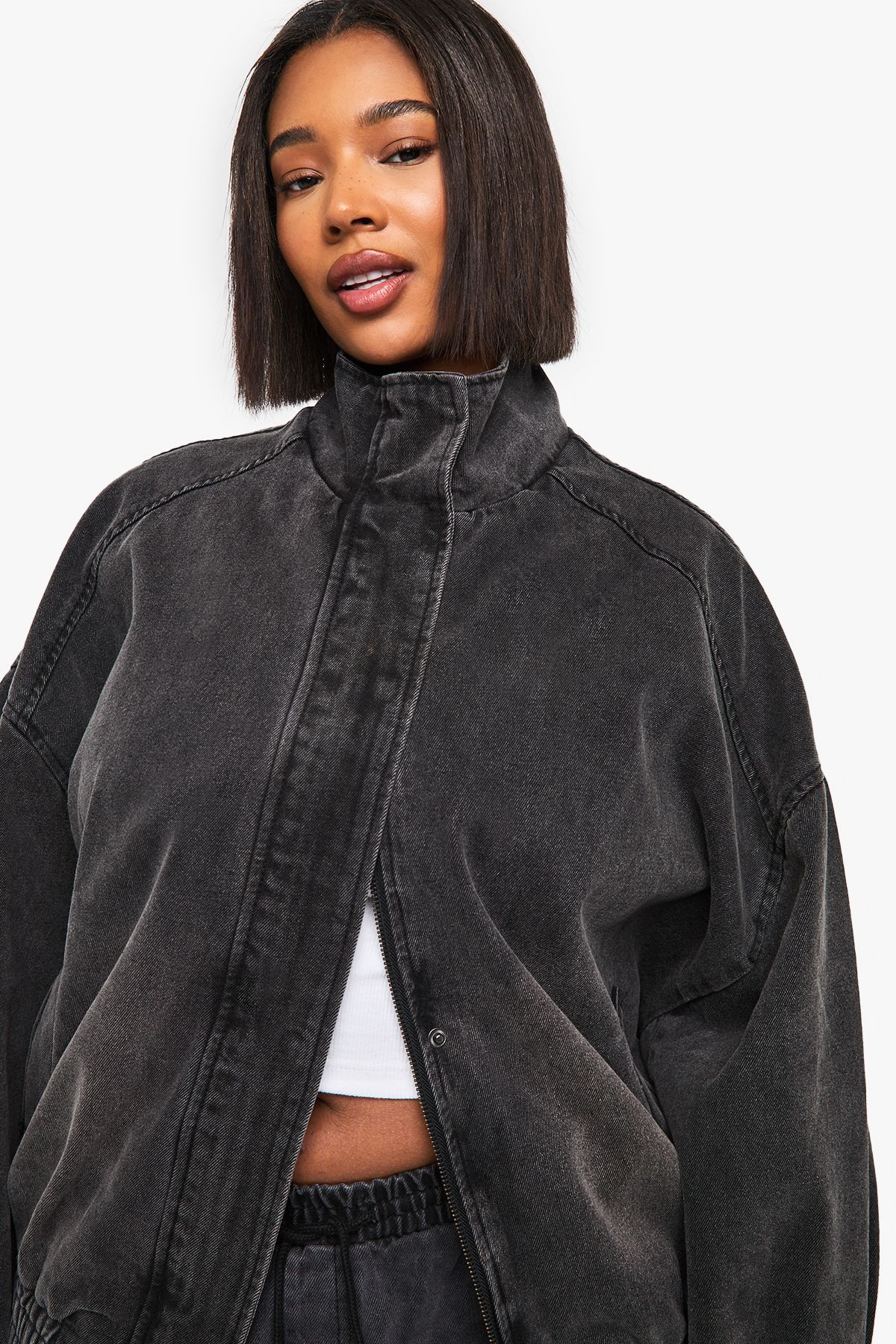 - Oversized bomber silhouette for a relaxed, on-trend look
