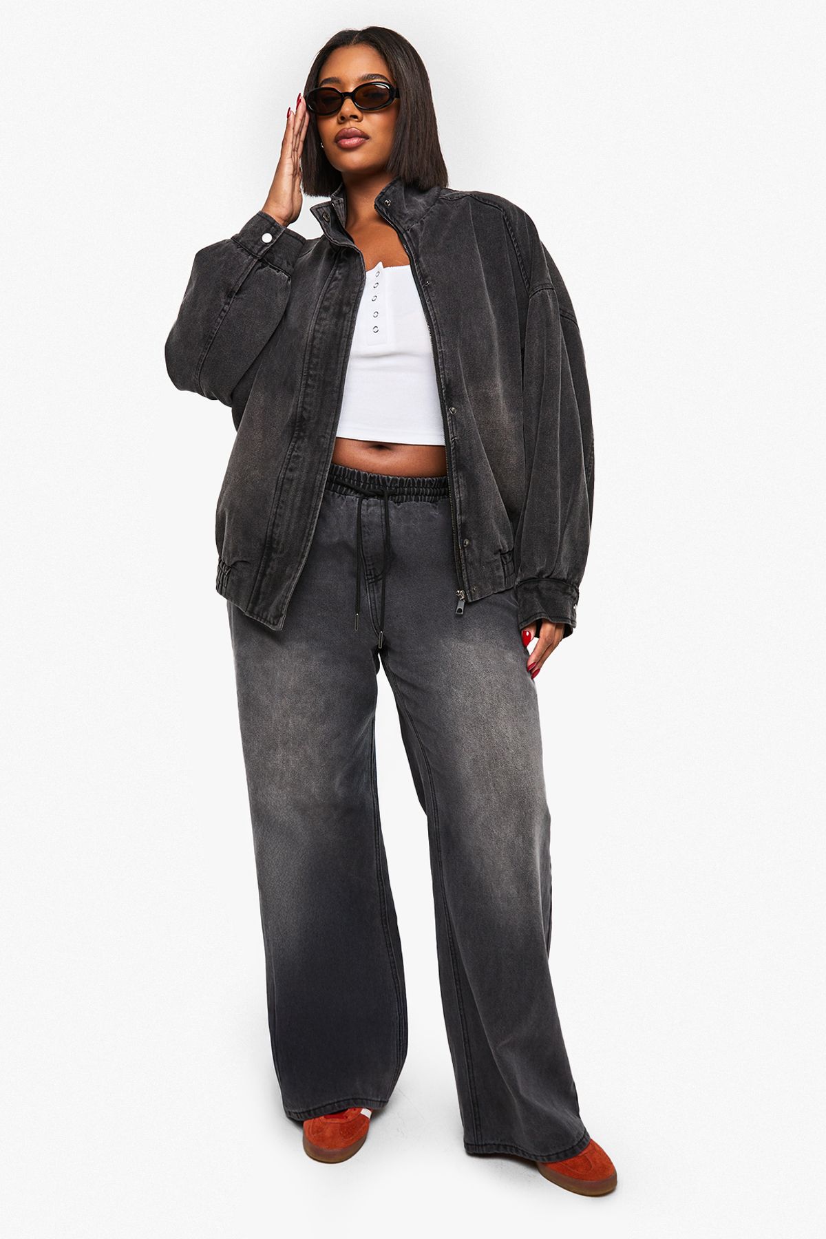 - Denim construction offering durability and timeless appeal Make a bold statement with this Plus Denim Oversized Bomber Jacket from Boohoo. The relaxed silhouette creates an effortlessly cool vibe whilst providing ample room for layering during cooler months. Style with a simple crop top and wide-leg trousers for a balanced contemporary look, or throw over a casual dress for an instant style upgrade. The versatile design transitions seamlessly from daytime outings to casual evening gatherings. Perfect for family get-togethers, weekend brunches or casual shopping trips with mates, this jacket adds an urban edge to any ensemble. Pair with trainers and your favourite jeans for an everyday look, or dress up with boots and statement jewellery for evening socials. This bomber jacket embodies Boohoo's commitment to inclusive fashion that doesn't compromise on trend-led style.