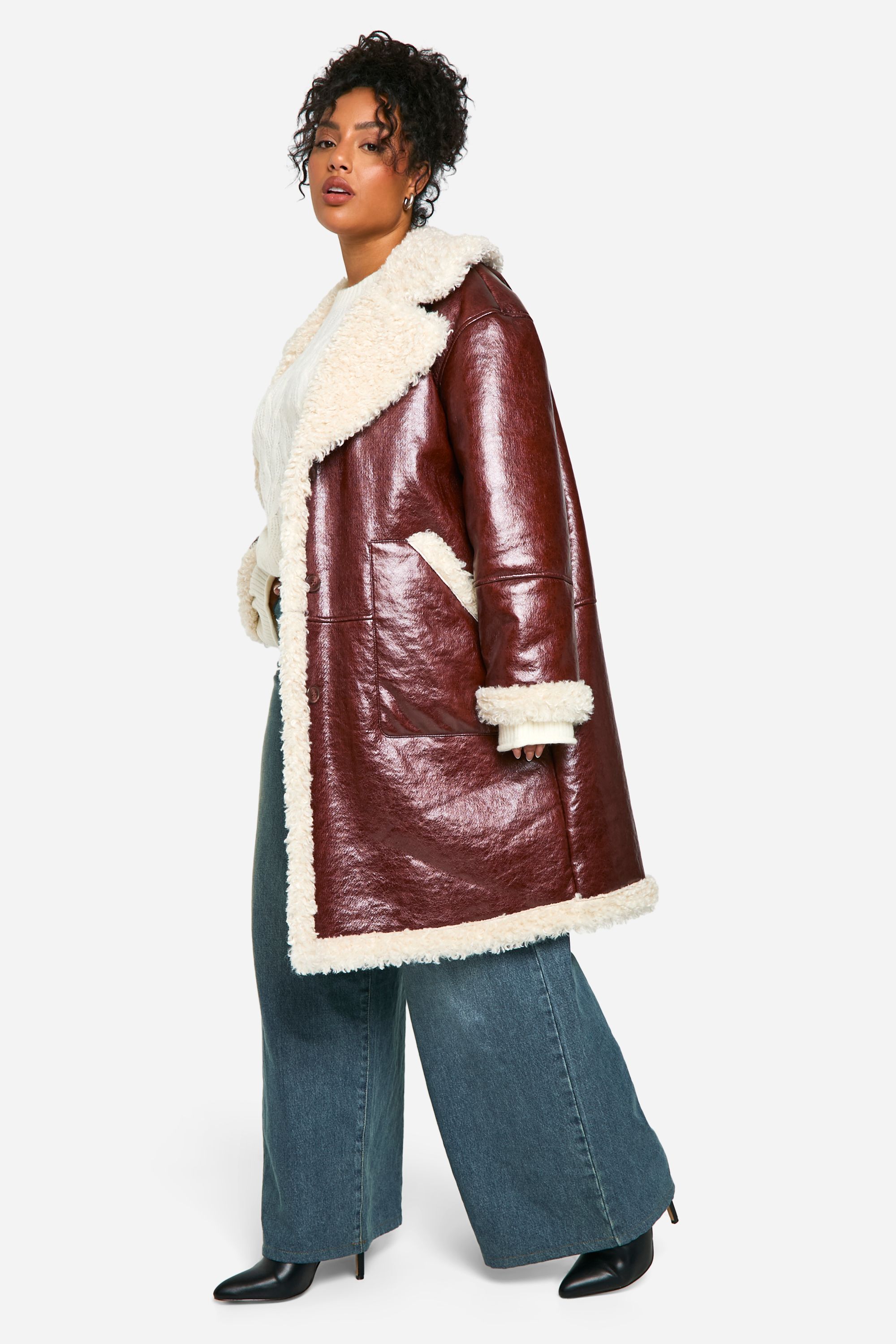 - Cuffed sleeves with teddy trim detailing Make a bold statement this season with our Plus Faux Leather Aviator Jacket featuring cosy teddy detailing. This eye-catching piece combines the rugged charm of a classic aviator with the comfort of plush lining, perfect for those chilly British evenings. Style it over a crisp white jumper and wide-leg jeans for a casual yet put-together look. The oversized fit allows for easy layering, making it versatile for various occasions. Whether you're heading to a family gathering or meeting friends for a pub lunch, this jacket will keep you warm and stylish. Pair it with ankle boots for a trendy edge or trainers for a more relaxed vibe. The contrasting textures and generous cut make this jacket a standout piece in any wardrobe, ensuring you'll turn heads wherever you go.
