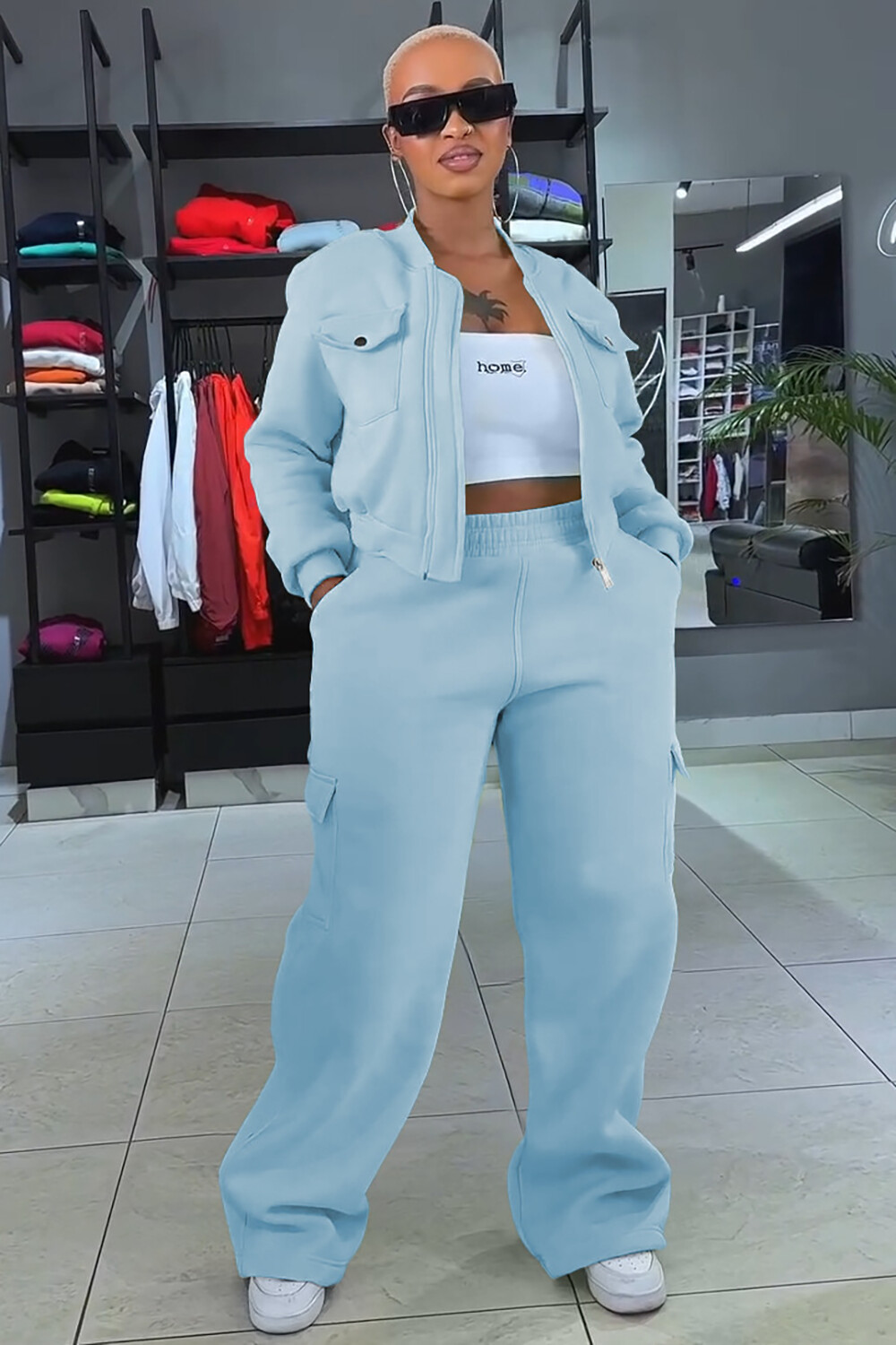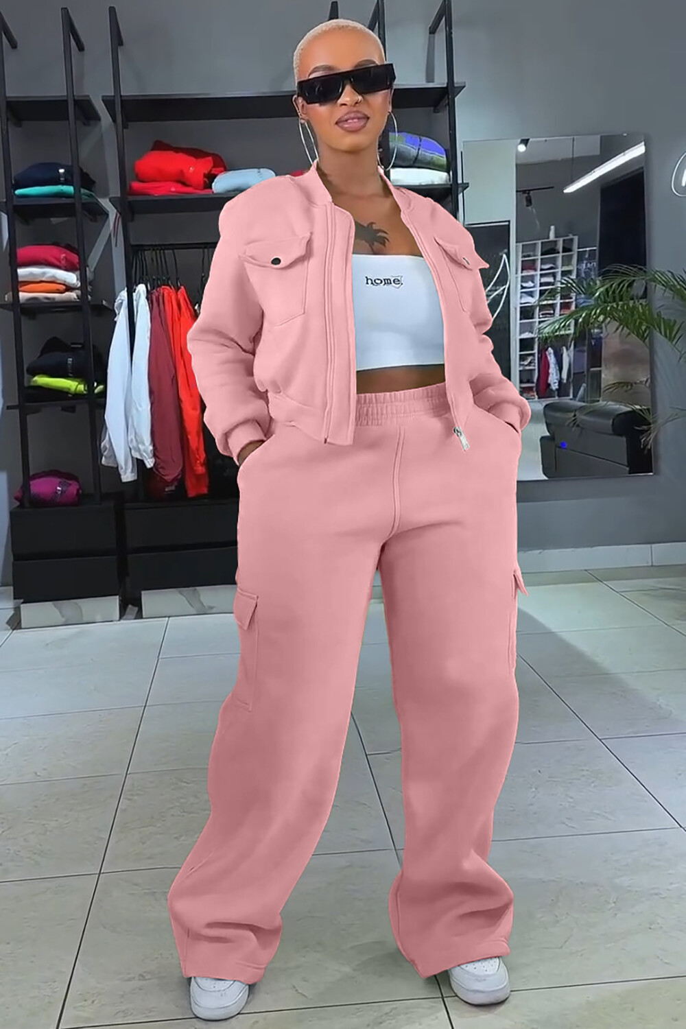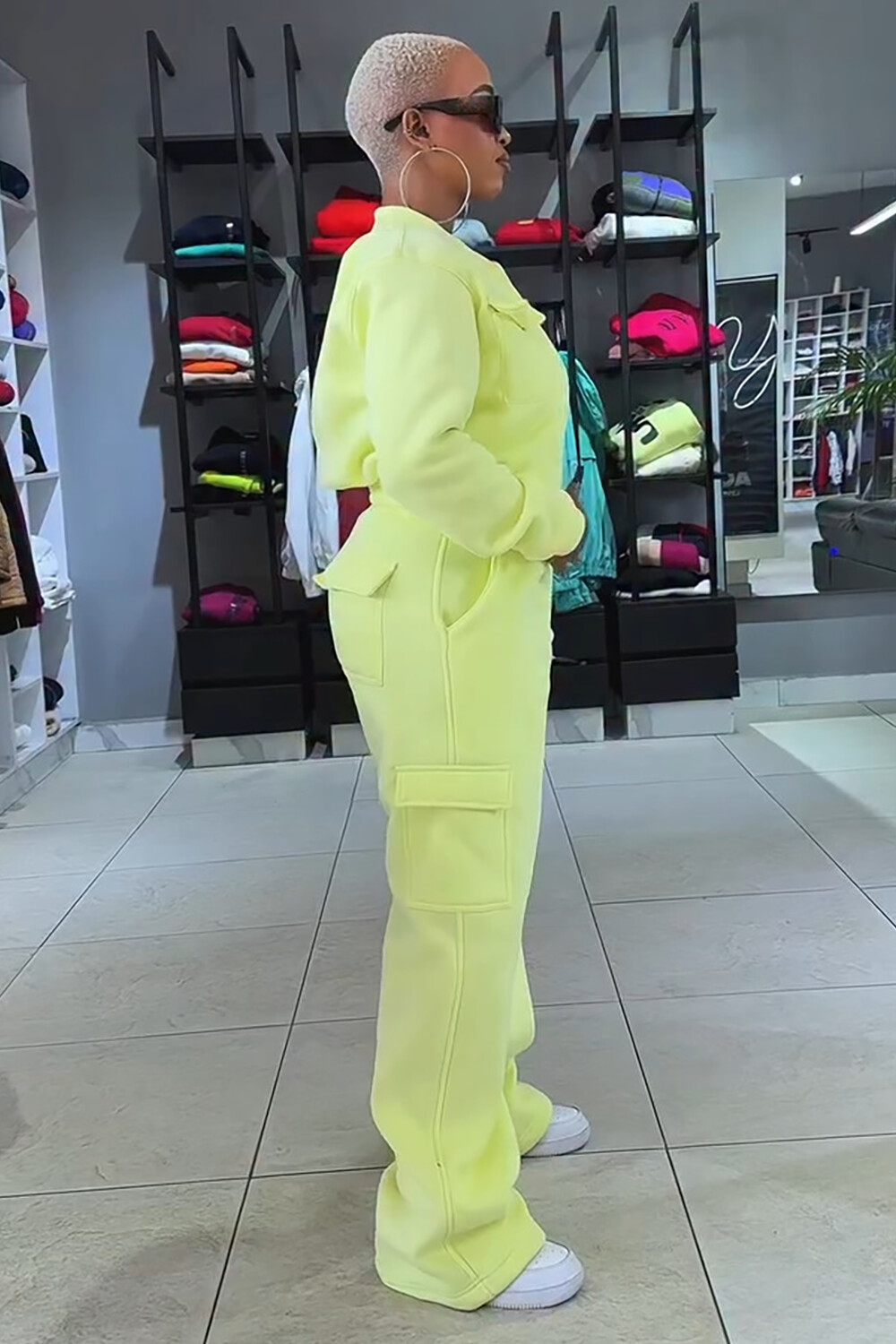 Pockets Crop Jacket Solid Color Straight Leg Pants 2pcs Set-Yellow