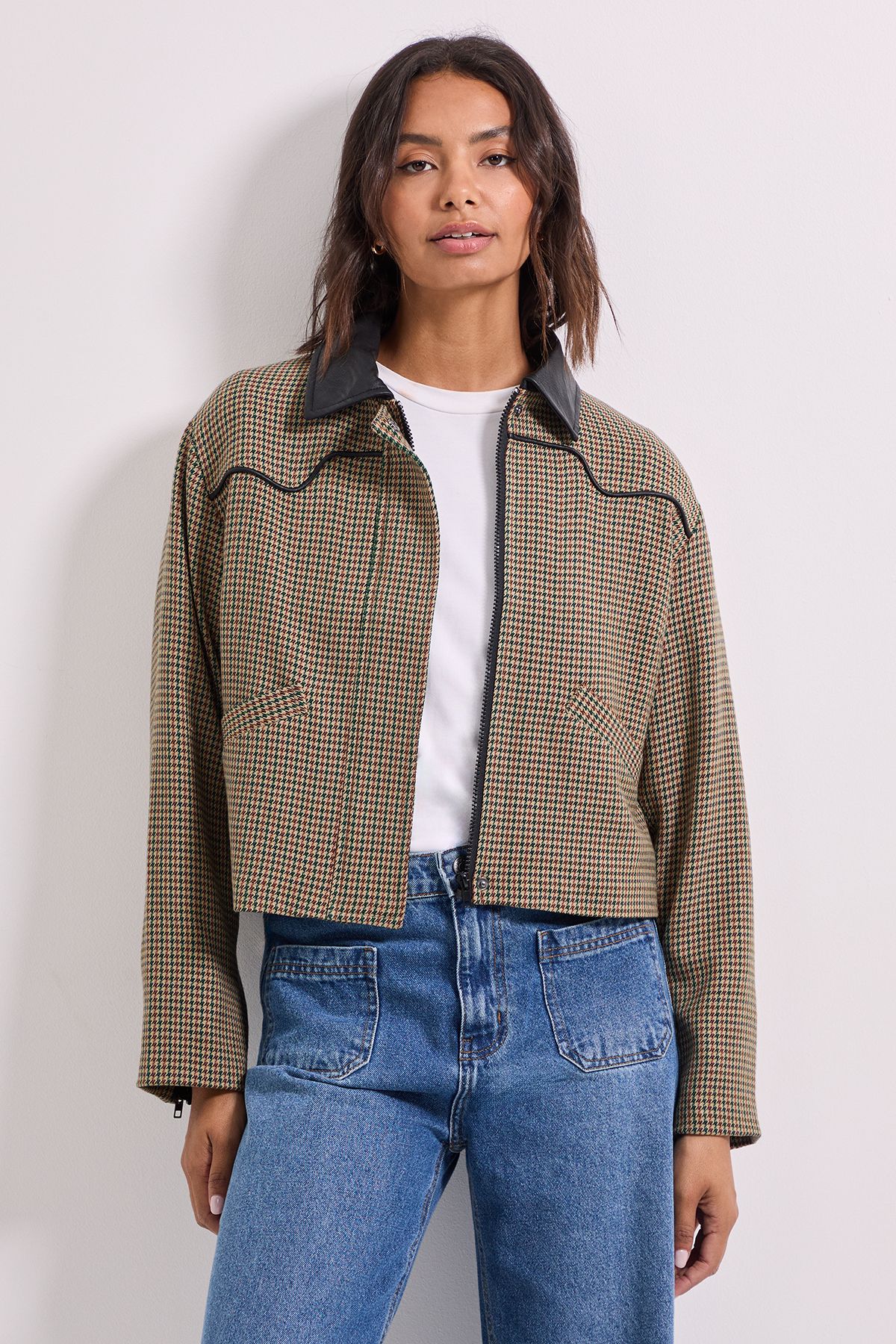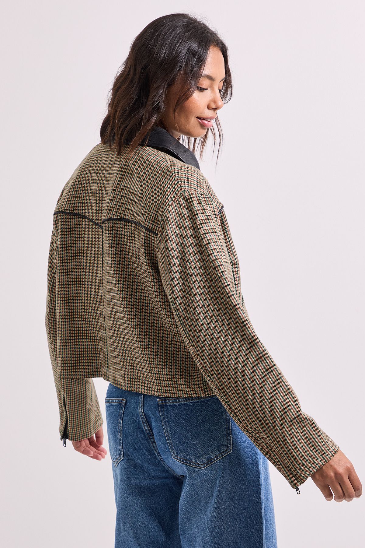 • Striking PU collar adds contemporary contrast to the classic check pattern