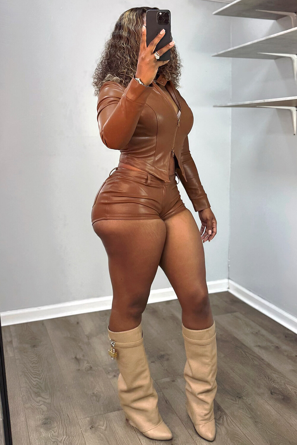 • PU Leather Long Sleeve Zipper Jacket Solid Color Skinny Shorts Set-Black