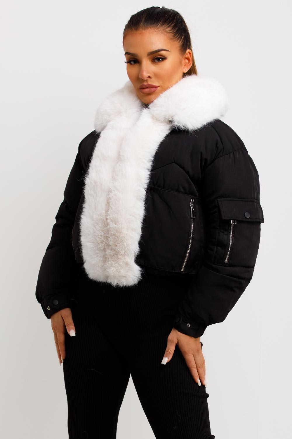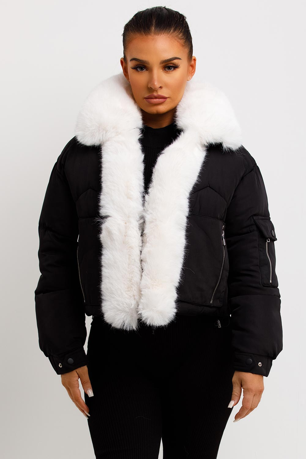 Puffer jacket with fur trim. This puffer jacket is going to replace all your existing outerwear pieces. Featuring premium puffer jacket with faux fur collar and trim zip fastening pockets, elasticated drawstring hem extremely warm weather resistant and windproof. Style this padded puffer jacket with any outfit to complete the look we are loving. This fur trim puffer jacket is also available in other colours.