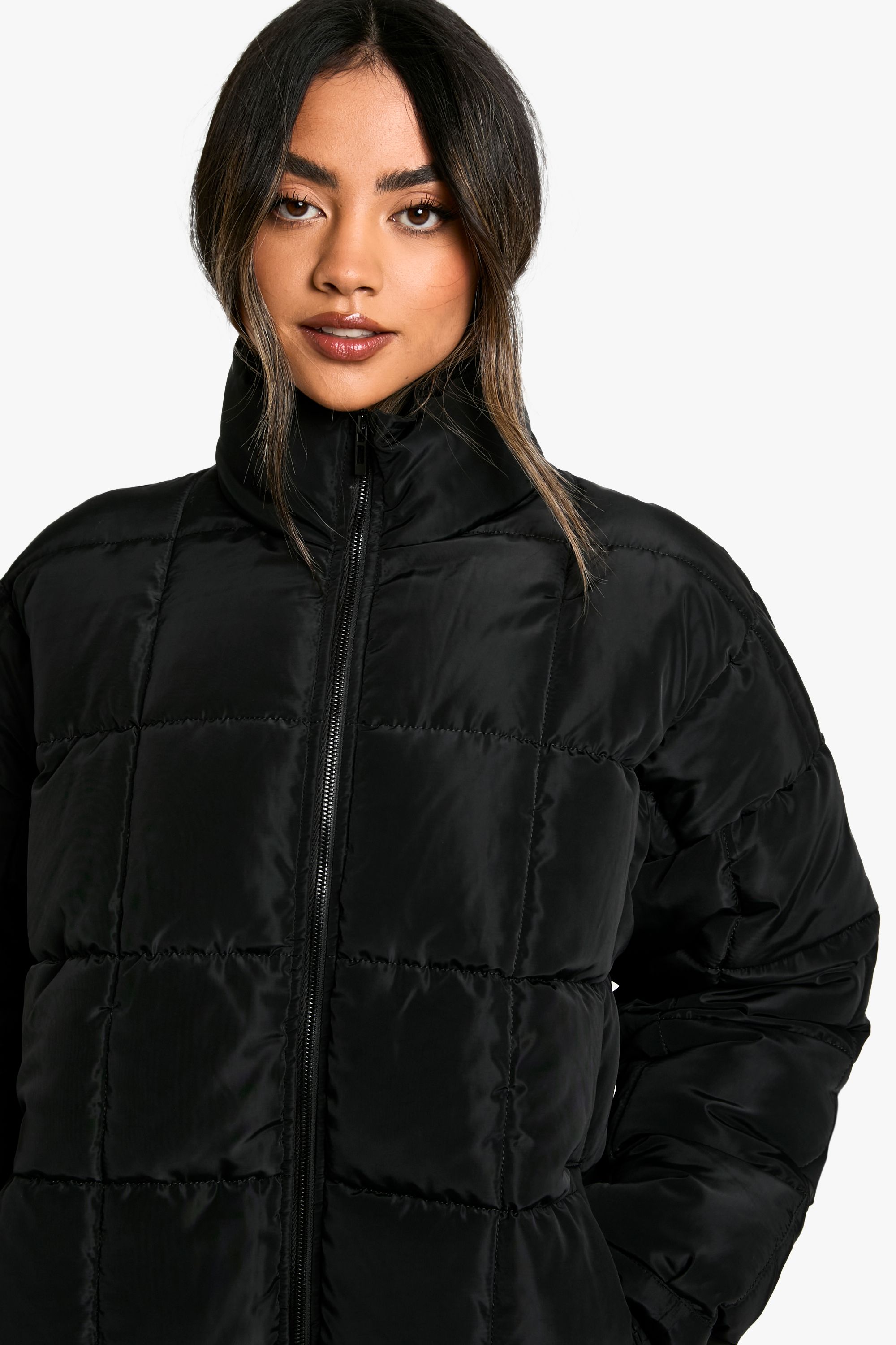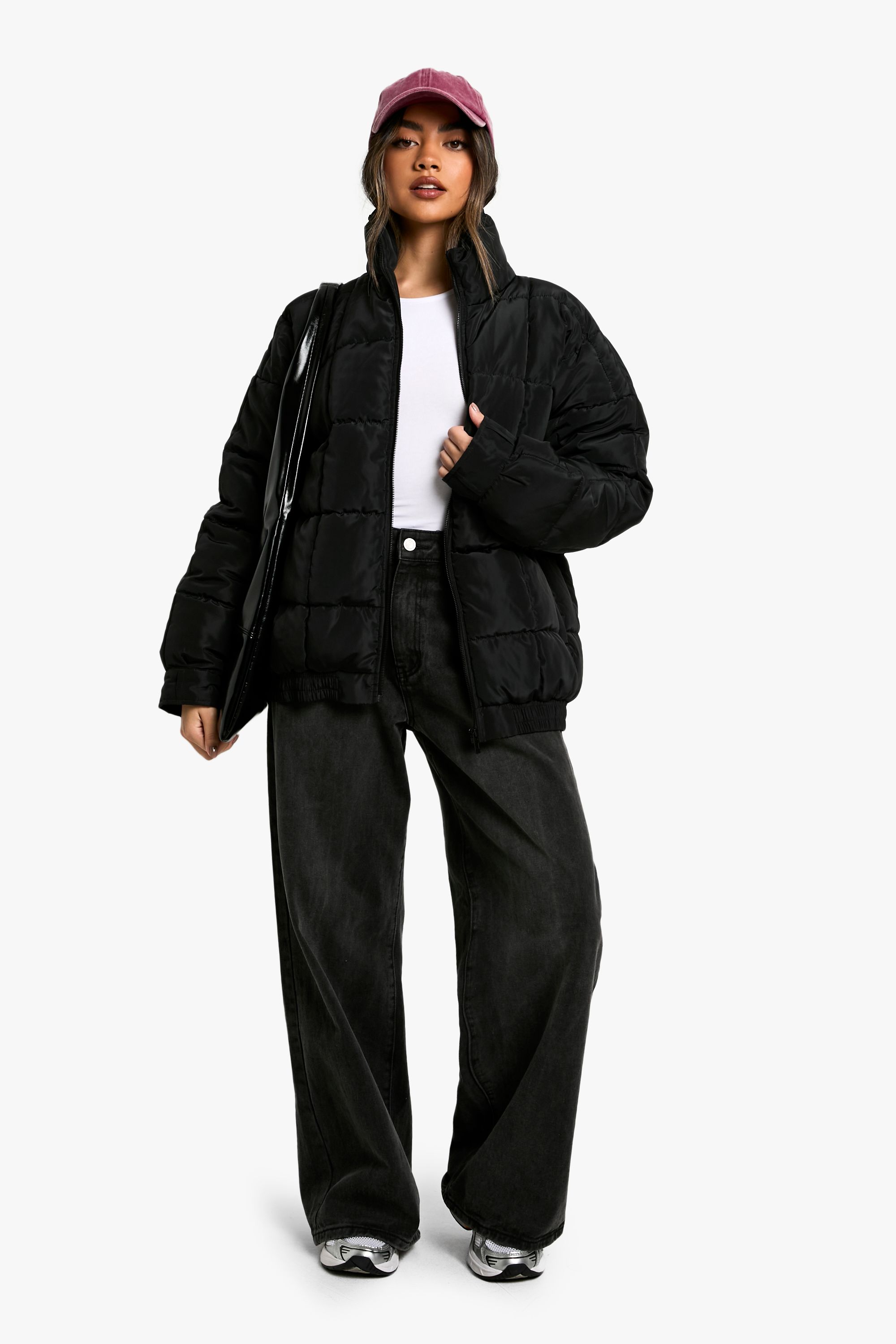- Embrace the cooler seasons with this trendy quilted jacket from Boohoo. Perfect for the fashion-forward woman who values both style and comfort, this piece offers a relaxed, oversized silhouette that's ideal for layering over your favourite outfits. The high collar provides extra protection against chilly winds, while the full-length zip allows for easy wear and temperature regulation. Style it with wide-leg trousers and trainers for a laid-back weekend look, or throw it over a midi dress and boots for a chic autumn ensemble. Whether you're heading to a casual family gathering or running errands around town, this jacket is sure to keep you cosy and on-trend. Its versatility makes it a wardrobe staple that you'll reach for time and time again, proving that practical outerwear can be just as stylish as it is functional.