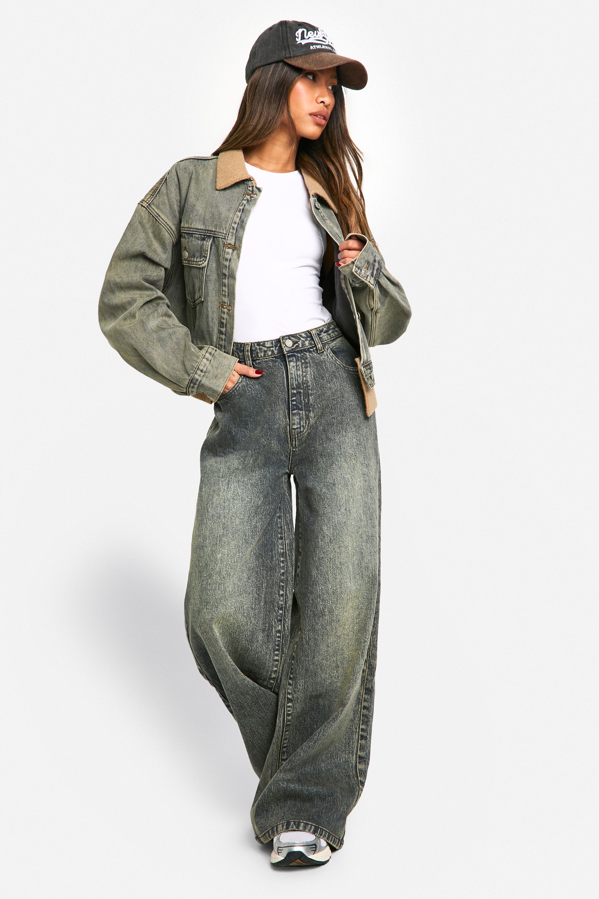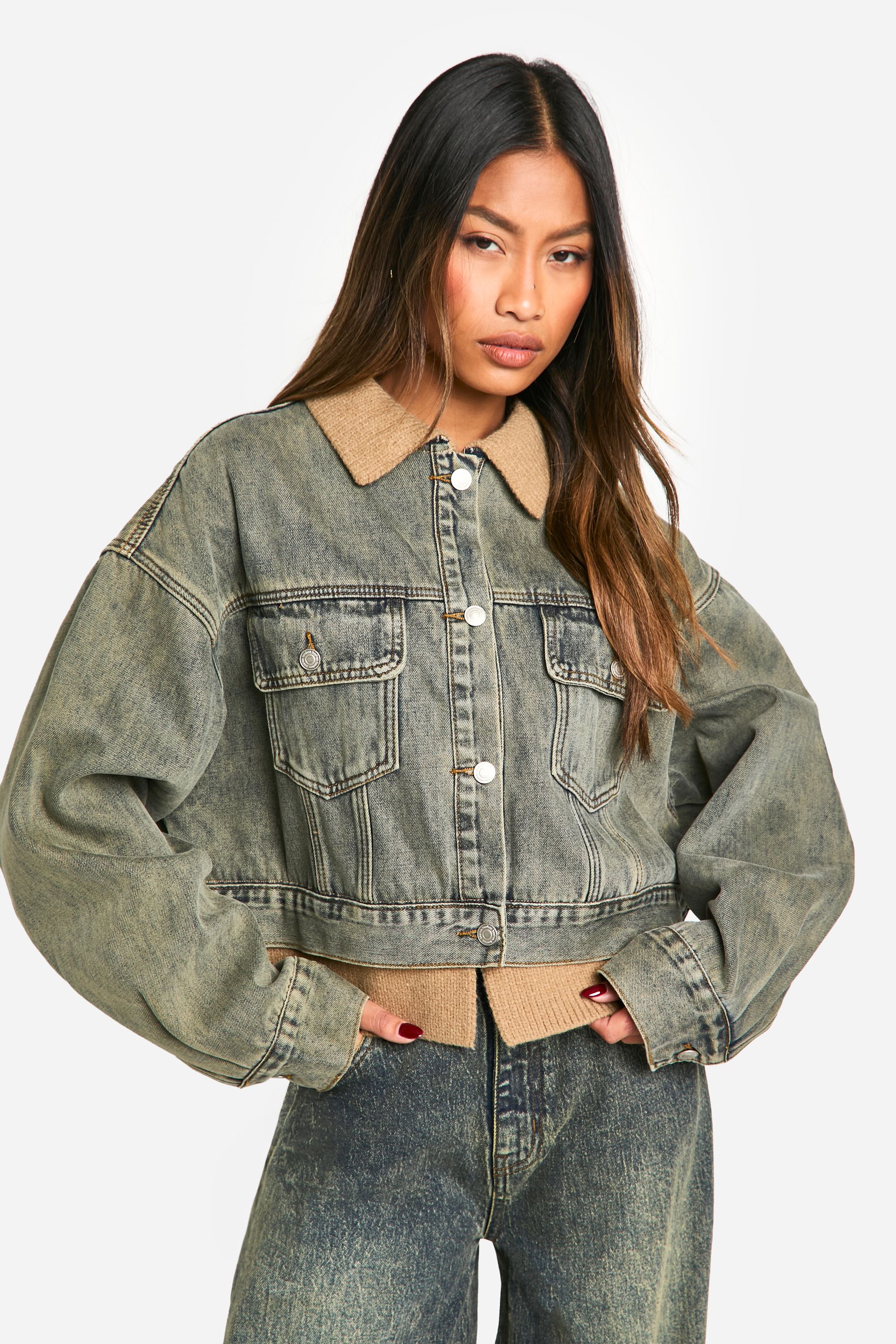 - This Boohoo jeans jacket showcases a perfect blend of classic style and contemporary flair. The oversized fit creates a relaxed, effortlessly cool look that's right on trend. The contrasting ribbed collar adds a distinctive touch, setting this jacket apart from traditional denim designs. Style it with wide-leg jeans and trainers for a casual day out, or throw it over a floral dress for a chic contrast at informal gatherings. The versatility of this piece makes it a wardrobe essential, easily transitioning from daytime errands to evening catch-ups with friends. For a quintessential British look, pair it with a vintage band tee, high-waisted trousers, and ankle boots. This jacket is your go-to for adding an edgy, laid-back vibe to any outfit, embodying the youthful spirit of the Boohoo brand.
