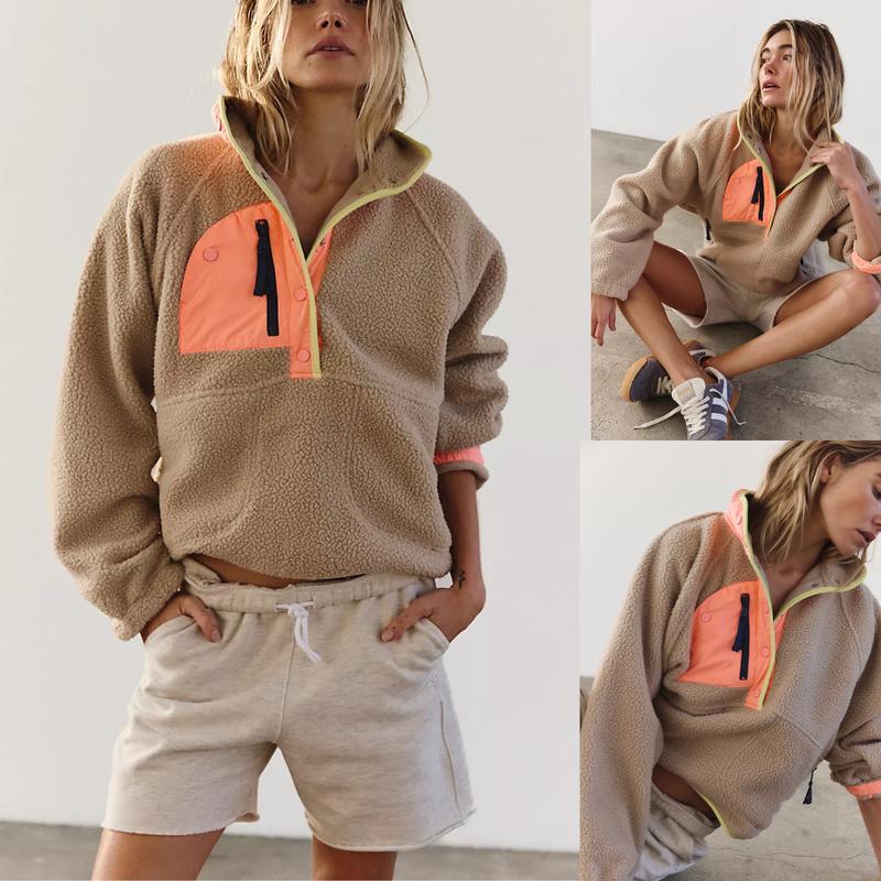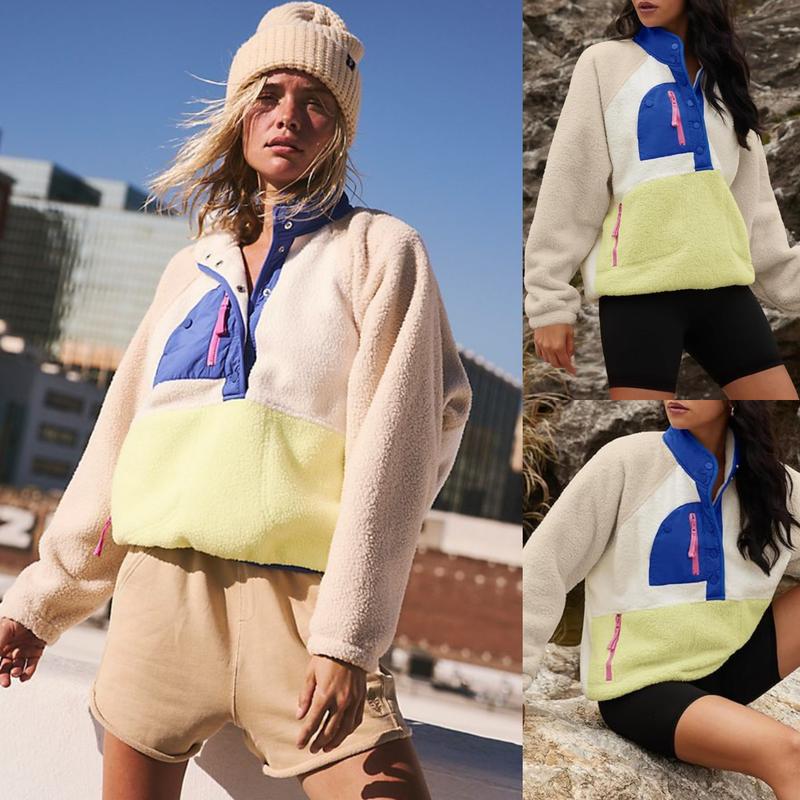 ✨ Casual and trendy, this fuzzy fleece pullover features a fashion-forward color block design. It includes a half snap button, stand collar, or lapel, raglan long sleeve, and two side zipper pockets. The cropped length and loose fit make it perfect for fall and winter. Stay cozy and stylish in this fuzzy hoodie jacket.
