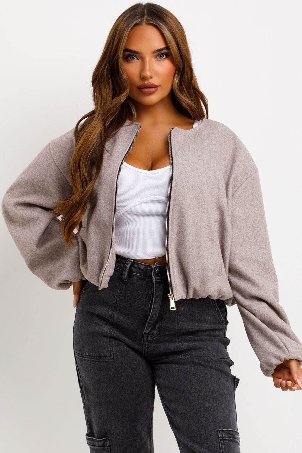 Soft bomber jacket. This bomber jacket is a must have for your new season outerwear wardrobe. Featuring soft bomber jacket with round neck elastic cuffs long sleeves pockets on front elasticated hem and zip up front. Style this bomber jacket with any outfit to complete the look we are loving. This soft bomber jacket is also available in other colours.