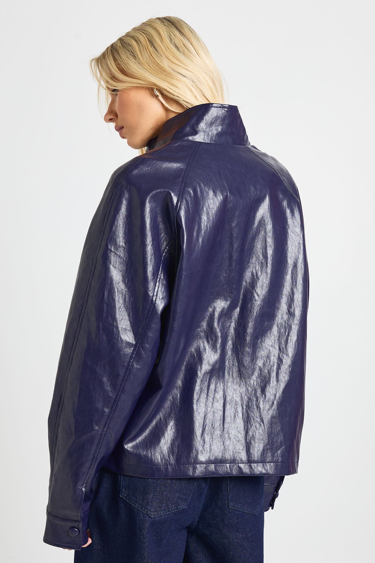 Soft Funnel Neck Faux Leather Bomber Jacket