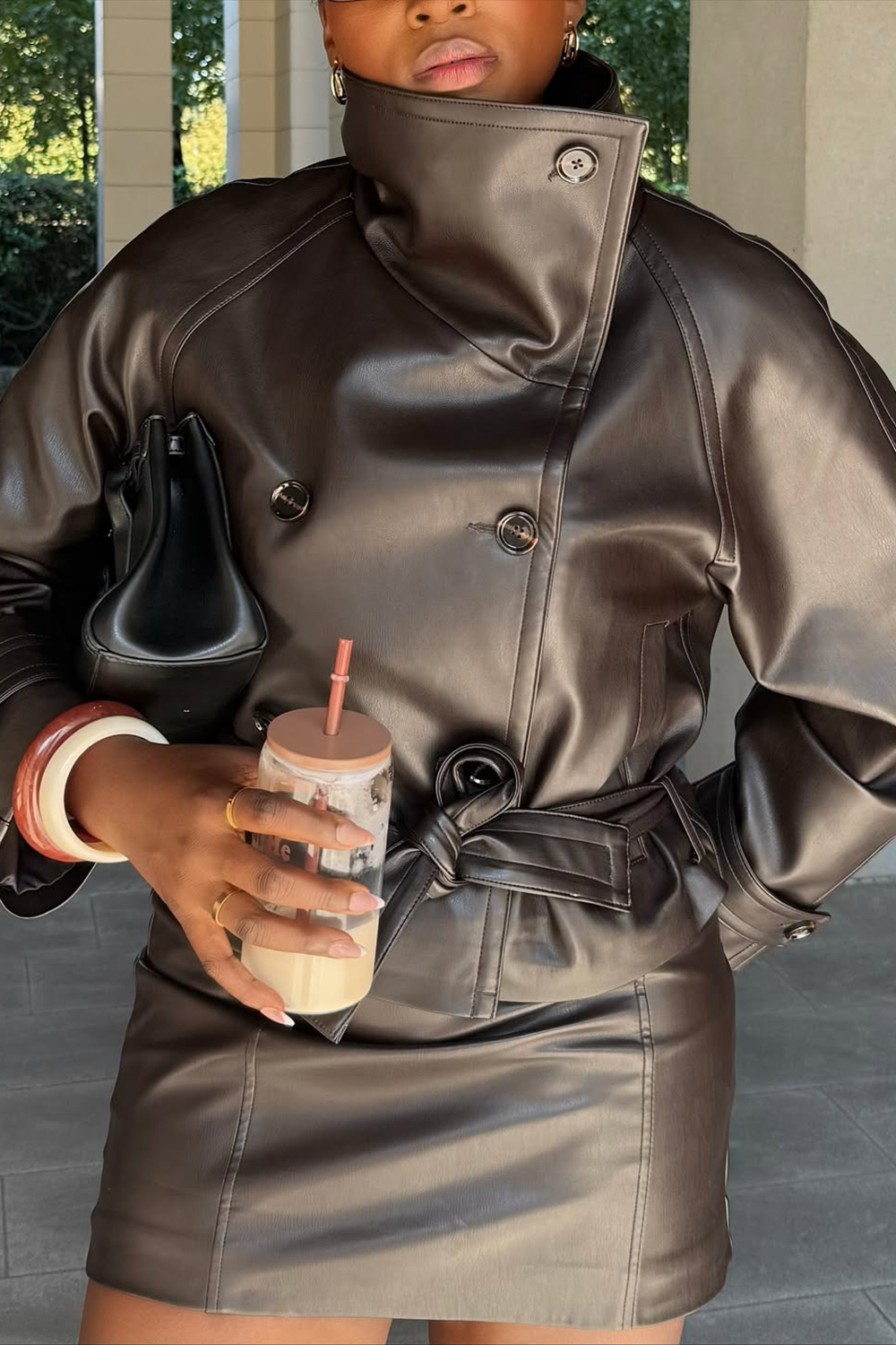 • Stand Collar Raglan Sleeve Jacket Skirt PU Leather 2pcs Set-Brown