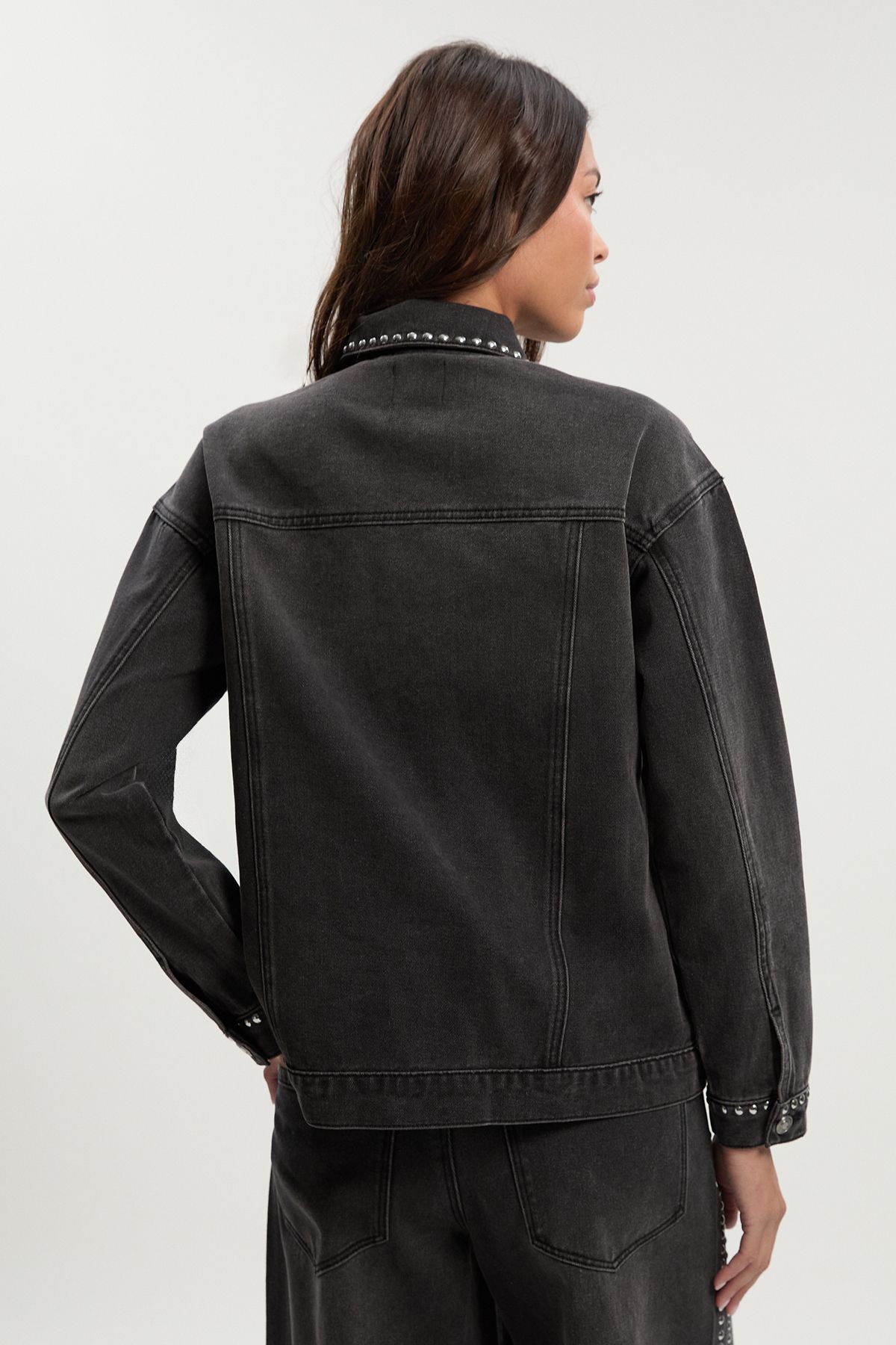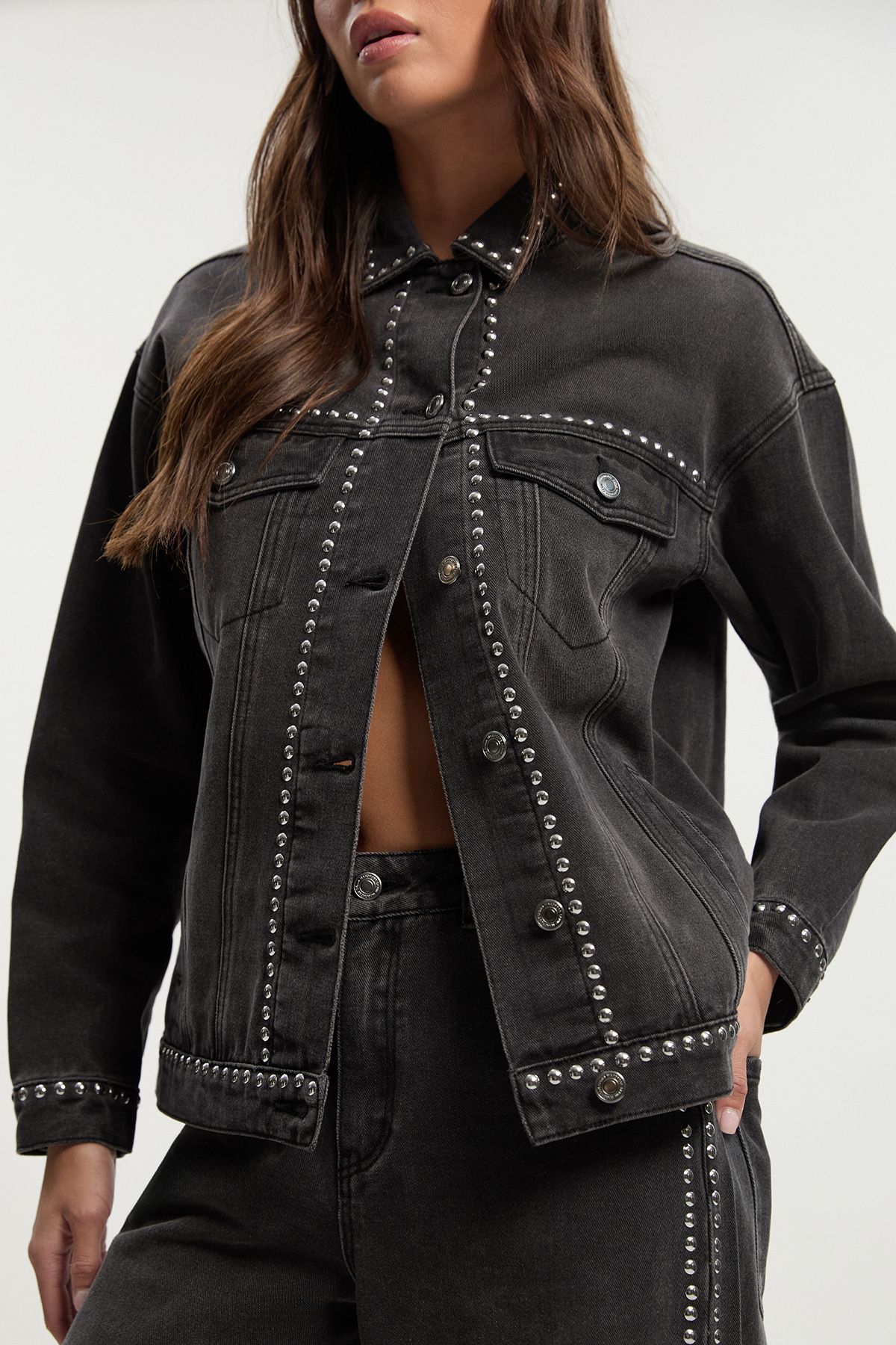 • Oversized fit denim jacket with eye-catching stud detailing along the edges and seams