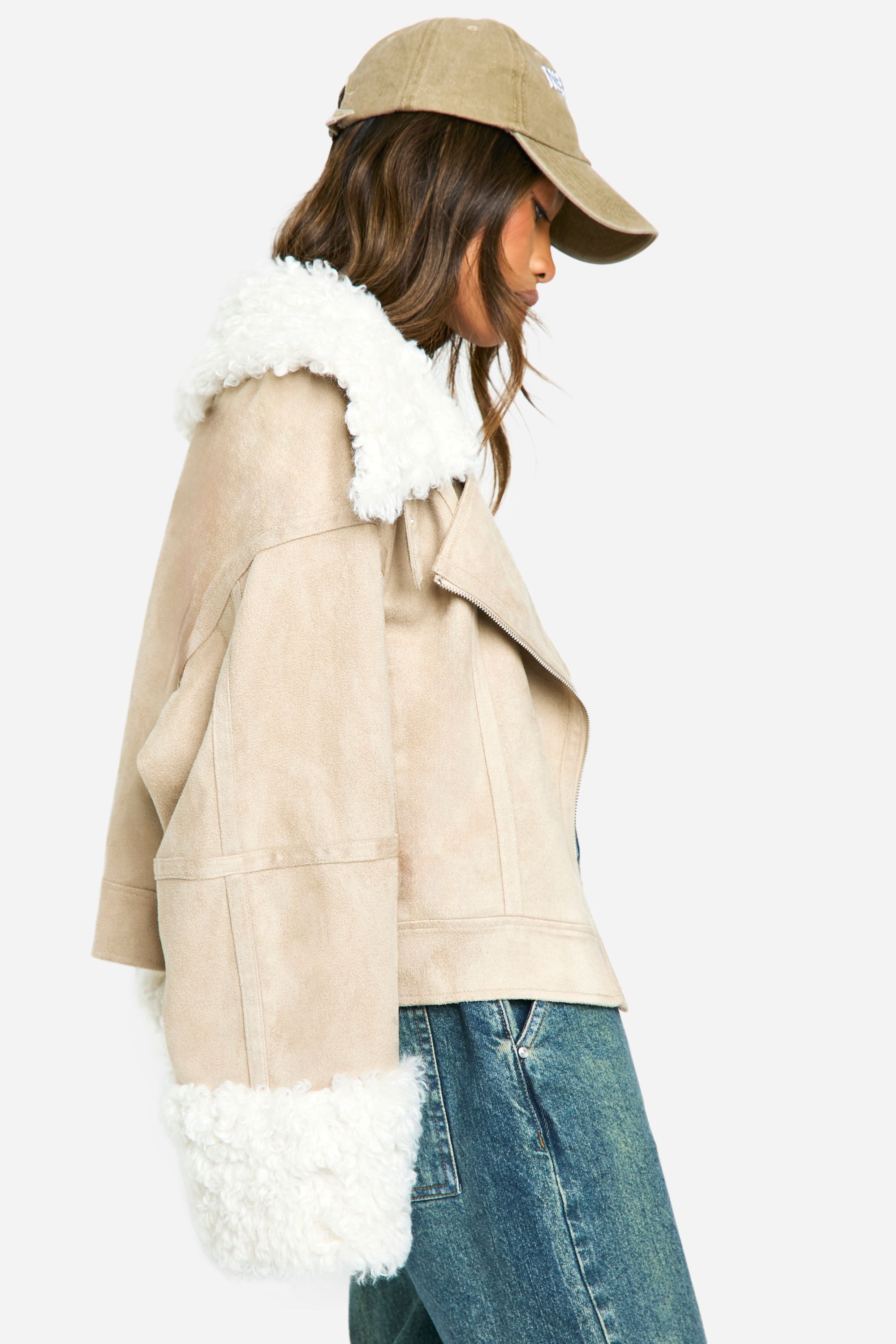 • Make a bold statement with this eye-catching teddy-biker jacket. The fusion of smooth outer fabric with plush faux fur accents creates a captivating textural contrast that's sure to turn heads. The oversized collar not only adds a chic element but also provides extra warmth on chilly days. Pair this trendy piece with your favourite jeans and a simple white tee for an effortlessly cool daytime look. For a night out with friends, throw it over a fitted dress and ankle boots. The cropped length makes it ideal for showing off high-waisted trousers or skirts. Whether you're heading to a casual family gathering or meeting mates for coffee, this jacket adds an instant edge to any outfit. Its versatility allows you to dress it up or down, making it a must-have addition to your wardrobe that you'll reach for time and time again.