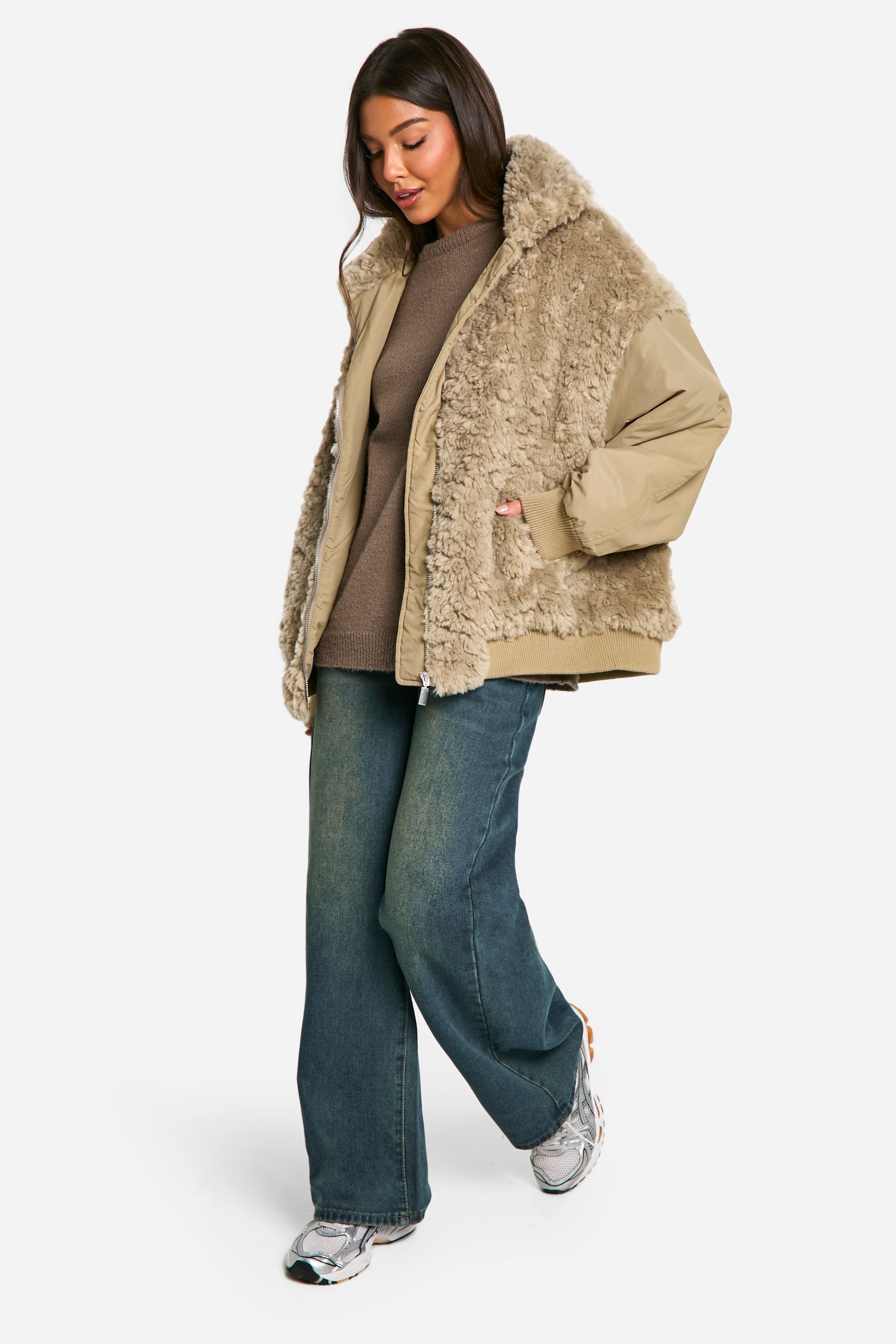 - Embrace the fusion of comfort and style with this oversized teddy bomber jacket from Boohoo. The plush borg fabric offers a luxurious feel, perfect for those chilly days when you want to wrap up in something cosy. The contrasting sleeves add a contemporary twist to the classic bomber silhouette, making it a standout piece in your wardrobe. For a casual day out, pair it with your favourite jeans and trainers, as seen on the model. The relaxed fit allows for easy layering over jumpers or hoodies, ideal for transitional weather. Whether you're heading to a family gathering or meeting friends for a coffee, this jacket will keep you warm without compromising on style. Its versatility makes it a go-to option for various casual occasions, from weekend brunches to evening walks in the park. The teddy bomber is a must-have for the fashion-forward individual who values both comfort and trendsetting looks.