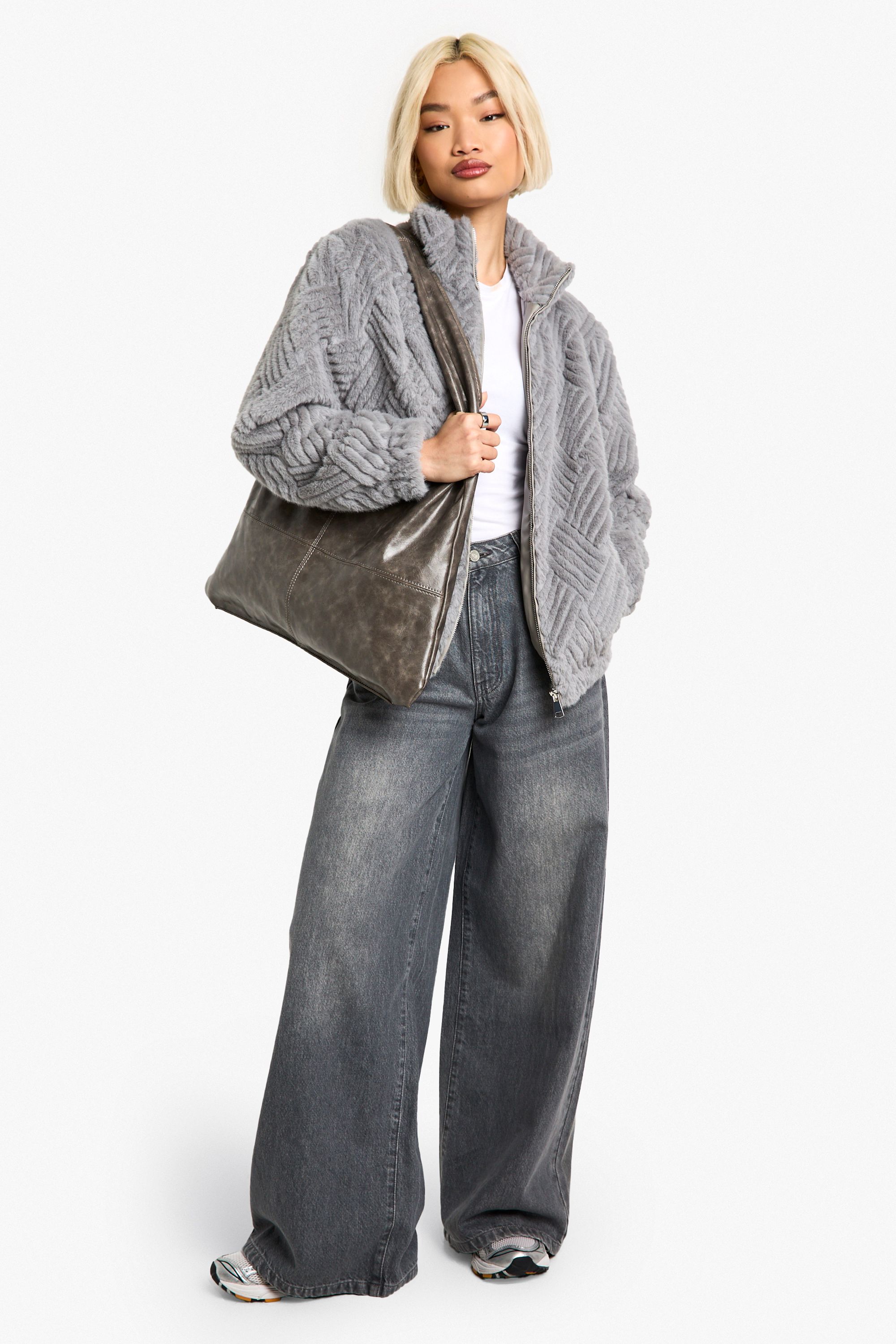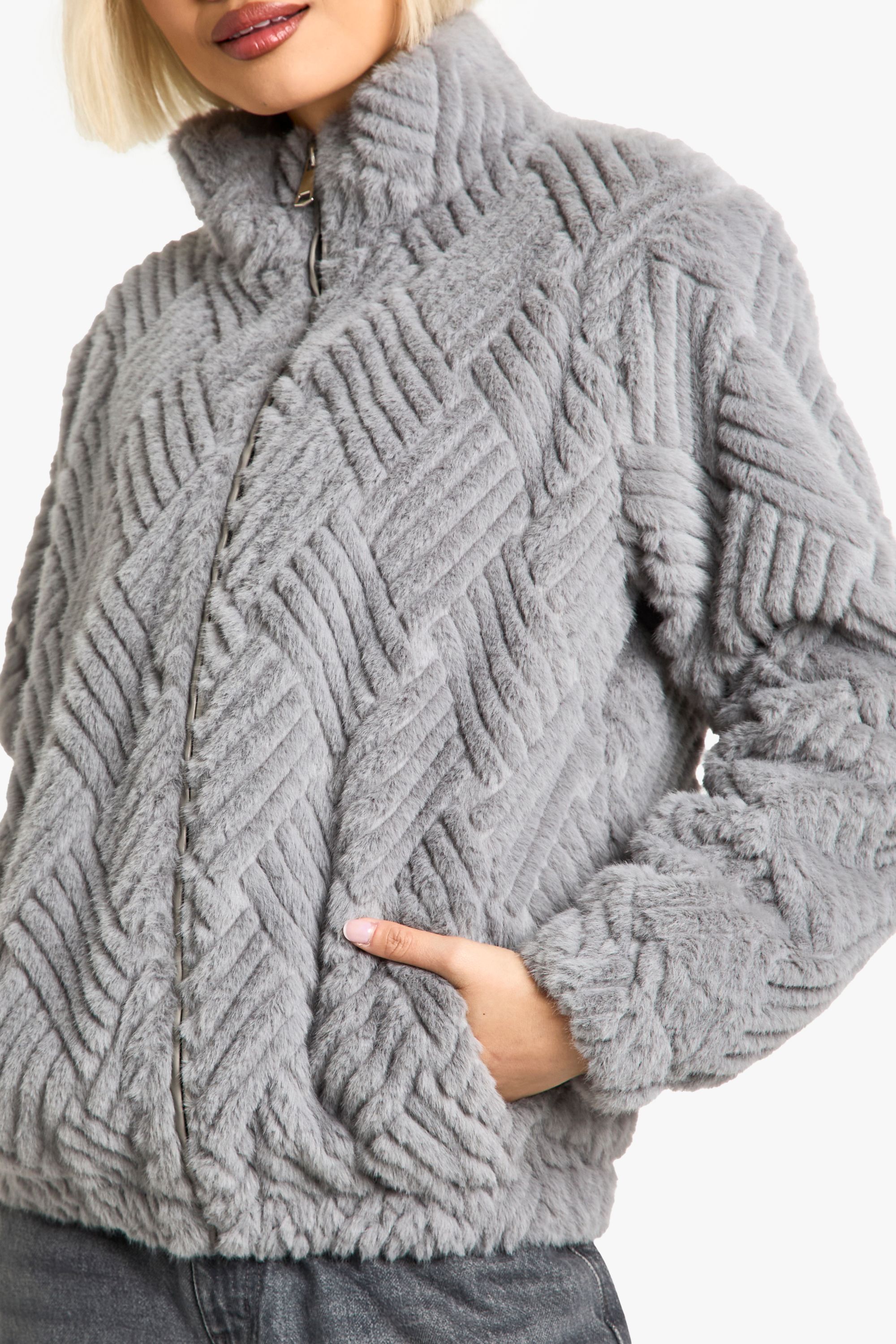 • Versatile zip-up front for adjustable coverage Embrace the chilly season with this eye-catching textured faux fur jacket. The bold chevron pattern adds a touch of sophistication to your casual wardrobe, while the oversize silhouette ensures maximum comfort. Perfect for those laid-back weekend brunches or impromptu coffee dates, this jacket pairs beautifully with wide-leg jeans and trainers for an effortlessly cool look. Layer it over a simple white tee and add a slouchy tote bag to complete your ensemble. The cosy high collar and soft texture make it ideal for snuggling up during outdoor events or family gatherings. Whether you're heading to the local pub or a casual dinner party, this jacket will keep you warm and stylish throughout the autumn and winter months.