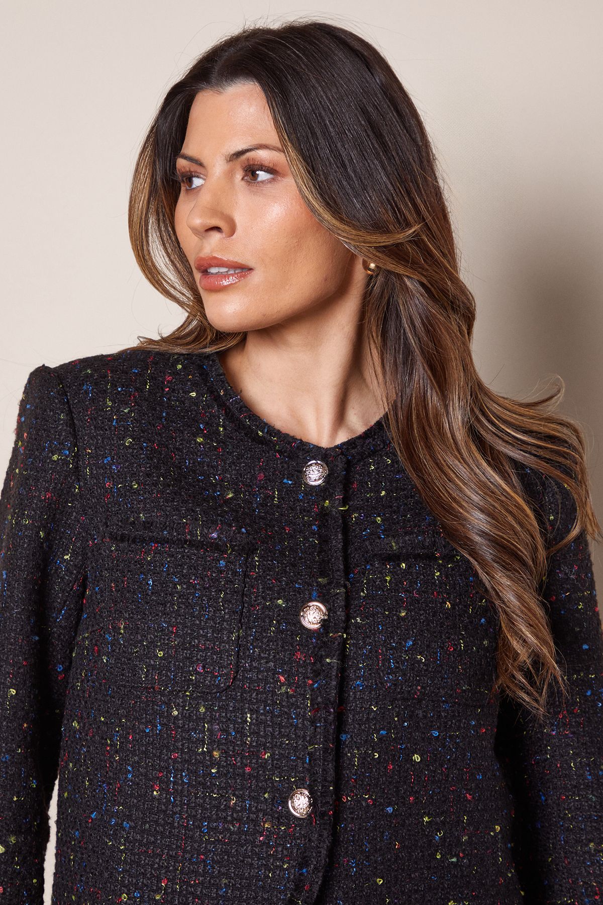 - This charming boucle jacket from Wallis brings sophisticated flair to your everyday wardrobe. The textured fabric with its distinctive trim creates visual interest while maintaining a polished appearance. Style as seen with wide-leg black trousers and a simple top for an effortlessly chic daytime look, perfect for lunch dates or family gatherings. The versatile edge-to-edge design works beautifully with both casual and smart-casual outfits - pair with your favourite jeans and a silk blouse for weekend brunches, or layer over a shift dress with ballet flats for an elegant ensemble. The boxy silhouette offers comfortable movement while creating a flattering shape that complements various body types. This jacket is an ideal transitional piece that will carry you through multiple seasons with ease and grace.