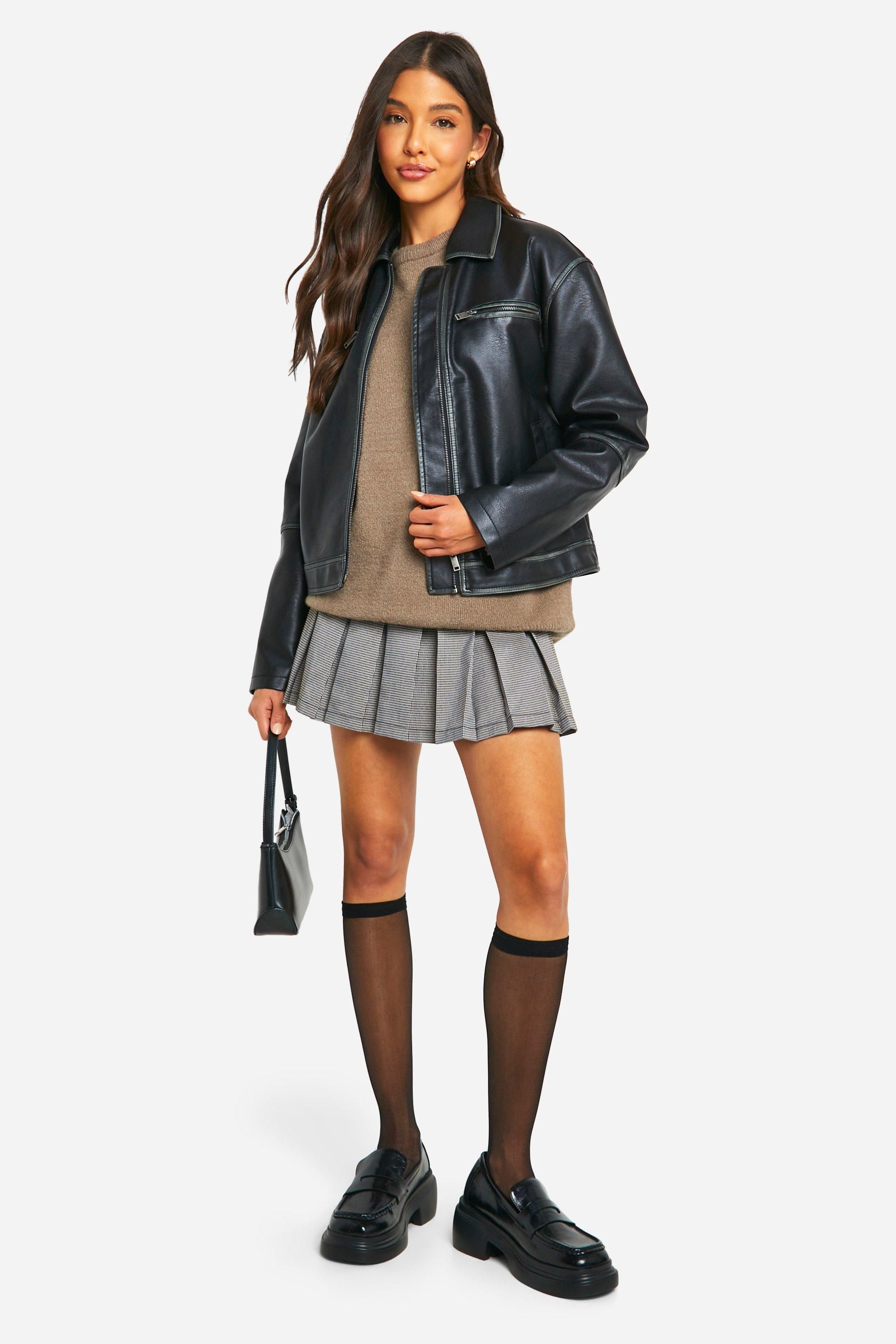 - Channel effortless cool with this vintage-inspired faux leather jacket. The relaxed silhouette and contrasting stitching create a look that's both edgy and approachable. Perfect for adding a touch of attitude to any casual ensemble, this jacket pairs brilliantly with a pleated mini skirt and chunky trainers for a trendy schoolgirl-meets-rocker vibe. Layer it over a cosy jumper and pair with your favourite jeans for a classic autumn look. The versatile design makes it an ideal choice for family gatherings, casual nights out, or weekend brunches with friends. Customise your style by rolling up the sleeves or popping the collar for added flair. This Boohoo jacket is a must-have piece that will quickly become a go-to in your wardrobe, offering endless styling possibilities for the fashion-forward woman who values both trend and comfort.