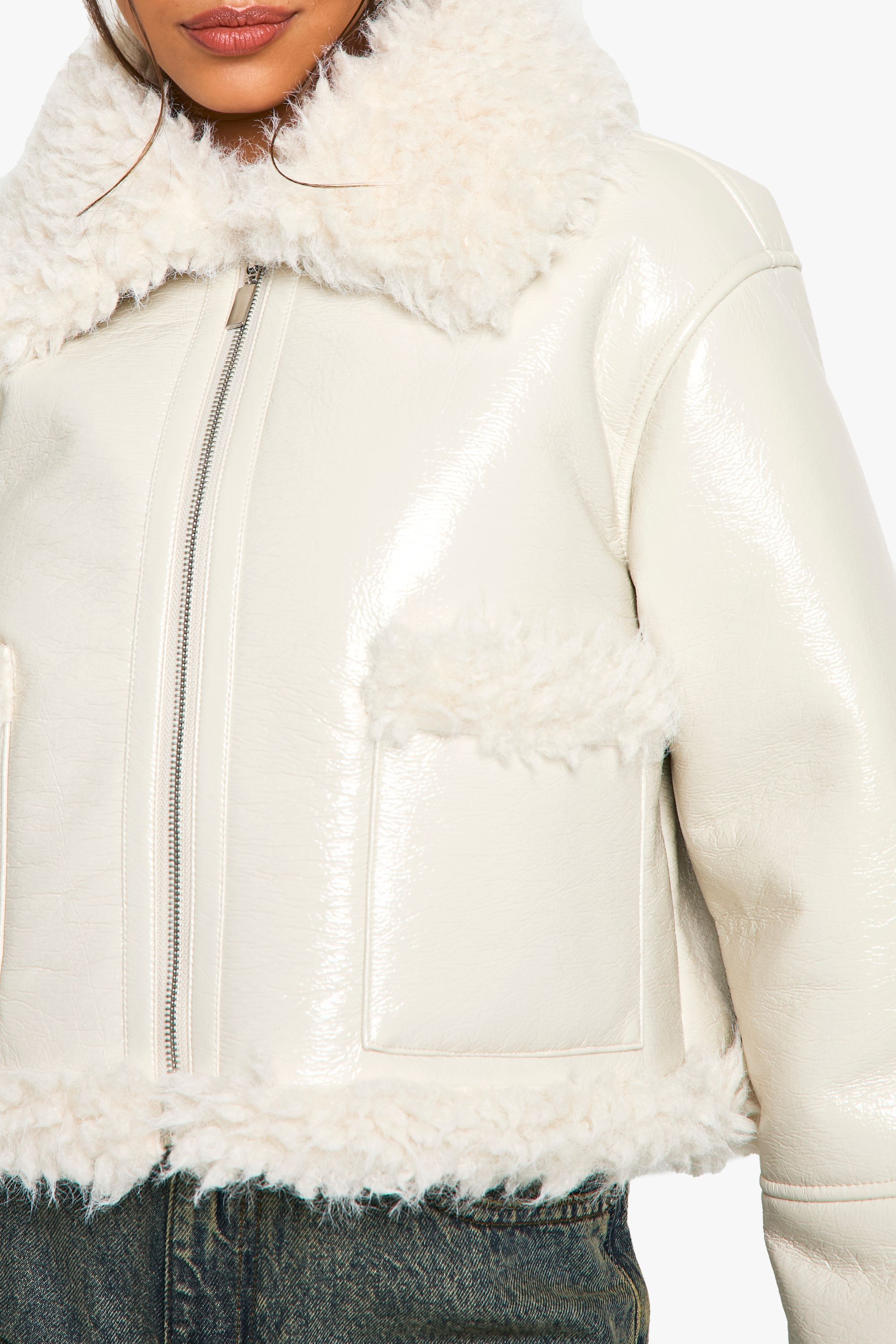 - Versatile design suitable for various casual occasions Make a statement in this eye-catching vinyl jacket with faux fur detailing. The contrasting textures create a visually intriguing piece that's sure to turn heads. Its cropped silhouette is ideal for pairing with high-waisted trousers or skirts, creating a balanced and flattering look. For a casual day out, style it with wide-leg jeans and trainers, as seen on our model. When the temperature drops, layer it over a chunky knit jumper for added warmth without compromising on style. This jacket is a versatile addition to your wardrobe, perfect for family gatherings, brunches with friends, or even a night out at your local pub. Its unique design allows you to effortlessly transition from day to night, making it a go-to piece for the fashion-forward woman who values both style and practicality.
