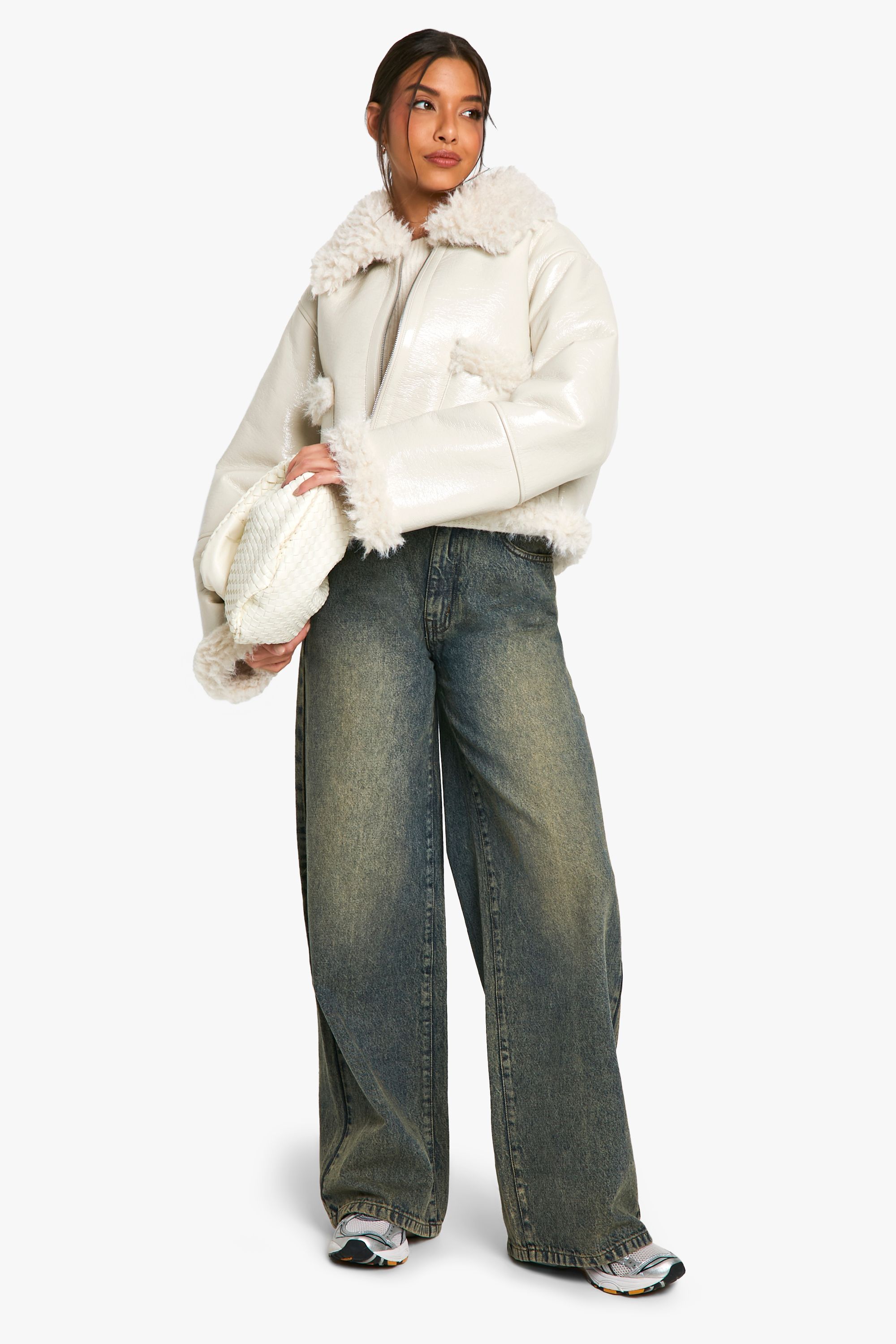 - Make a statement in this eye-catching vinyl jacket with faux fur detailing. The contrasting textures create a visually intriguing piece that's sure to turn heads. Its cropped silhouette is ideal for pairing with high-waisted trousers or skirts, creating a balanced and flattering look. For a casual day out, style it with wide-leg jeans and trainers, as seen on our model. When the temperature drops, layer it over a chunky knit jumper for added warmth without compromising on style. This jacket is a versatile addition to your wardrobe, perfect for family gatherings, brunches with friends, or even a night out at your local pub. Its unique design allows you to effortlessly transition from day to night, making it a go-to piece for the fashion-forward woman who values both style and practicality.