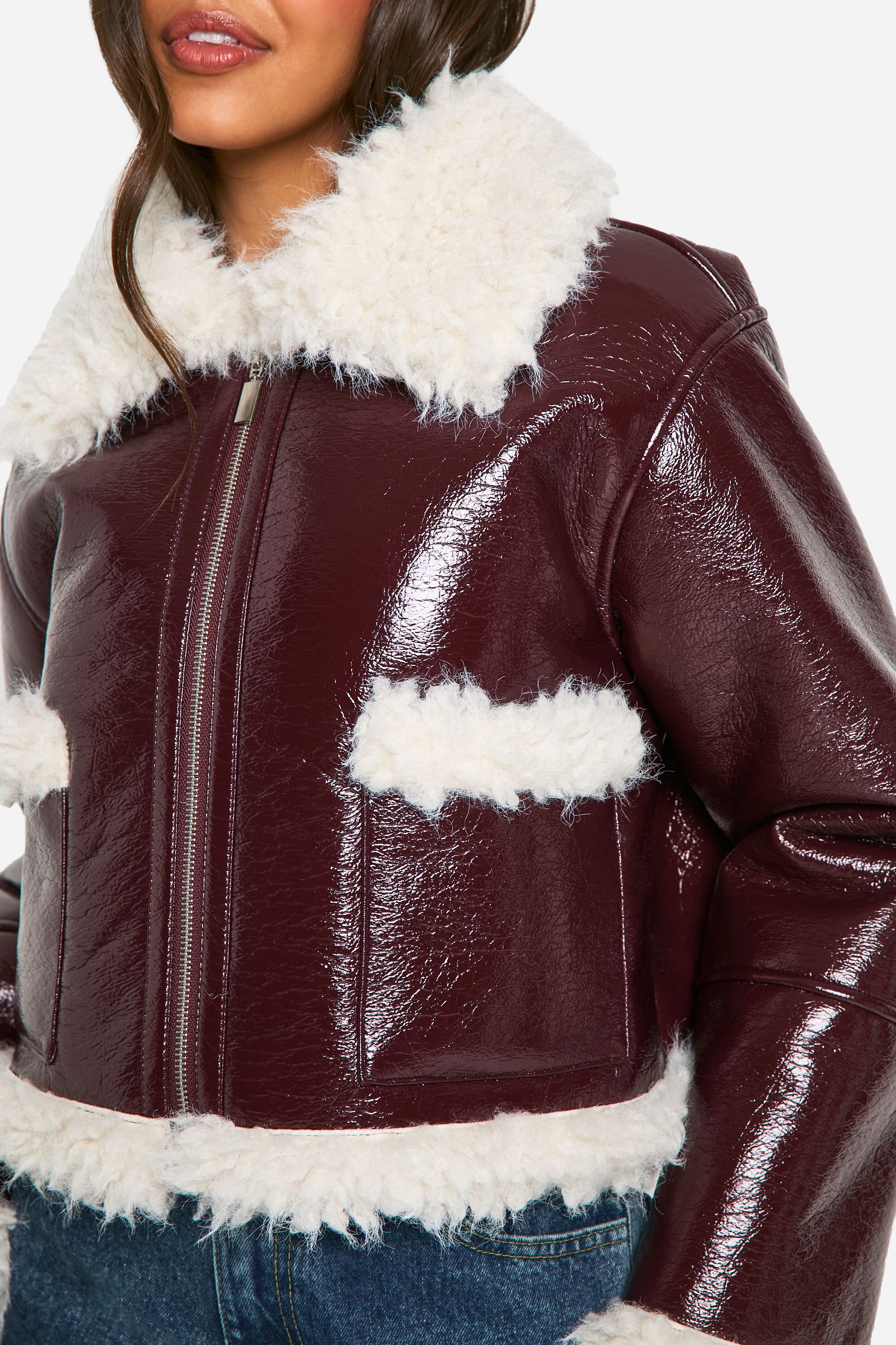 - Striking vinyl jacket with plush faux fur trim