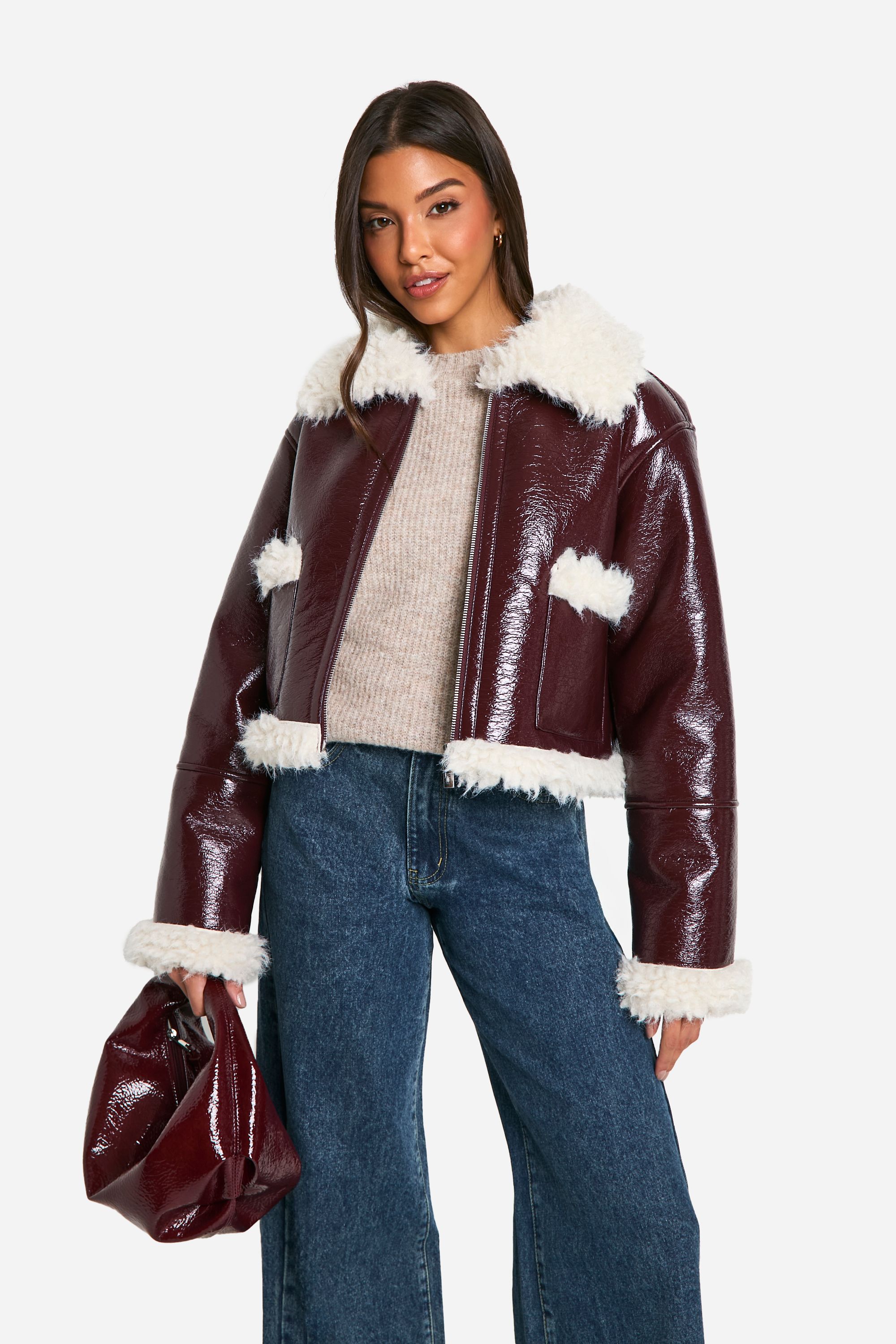 - Make a bold statement with this eye-catching vinyl jacket from Boohoo. The glossy exterior contrasts beautifully with the soft faux fur trim, creating a look that's both edgy and cosy. Perfect for the fashion-forward woman who wants to stand out from the crowd, this jacket can be styled in numerous ways. Pair it with wide-leg jeans and a neutral jumper for a balanced ensemble, or throw it over a mini dress and ankle boots for a night out with friends. The cropped length adds a contemporary touch, making it ideal for showing off high-waisted bottoms. Whether you're heading to a casual family gathering or meeting mates for coffee, this jacket will keep you warm and stylish. Its versatile design ensures it will become a go-to piece in your wardrobe, easily transitioning from day to night with the right accessories.