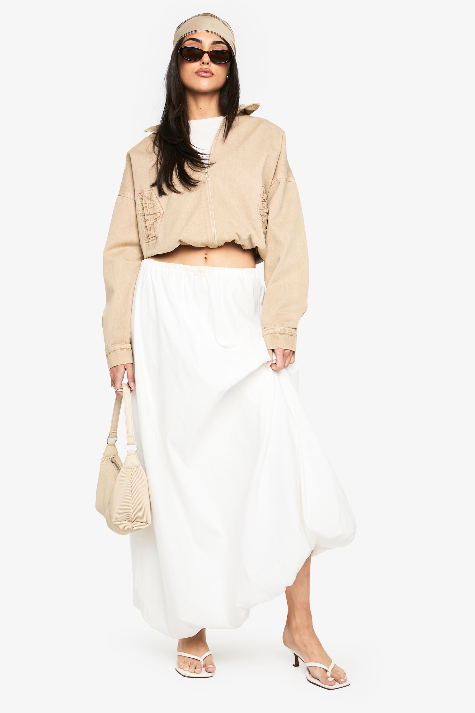 - This versatile bomber jacket brings casual cool to your everyday wardrobe. The cropped length pairs beautifully with high-waisted trousers or flowing maxi skirts as shown on our model. For daytime outings, style with a simple white tee, wide-leg trousers and trainers, adding a matching headscarf for a coordinated look. When temperatures drop, layer over a lightweight jumper for added warmth without compromising on style. Perfect for weekend brunches, casual shopping trips or relaxed evening gatherings with friends. The neutral tone makes it an ideal companion piece that works seamlessly with both bold prints and understated basics, allowing you to customise your look for different occasions whilst maintaining that effortlessly chic Boohoo aesthetic.