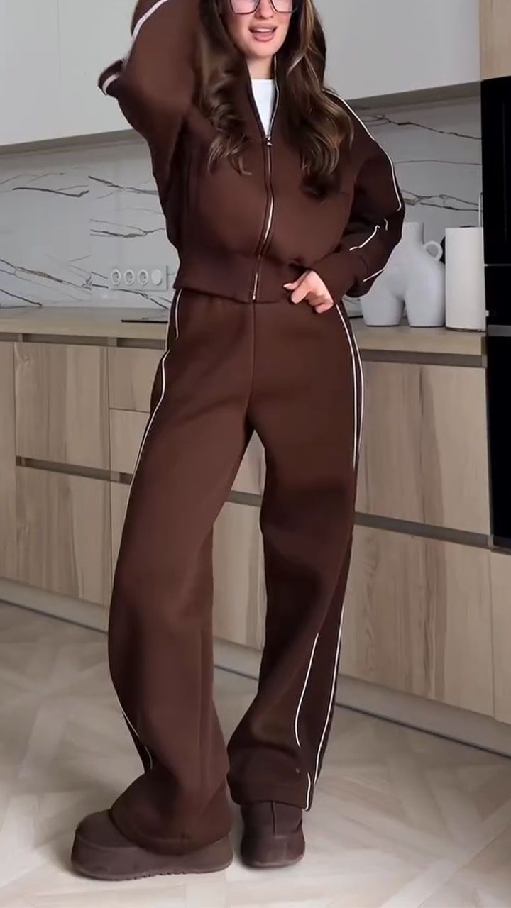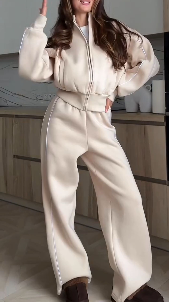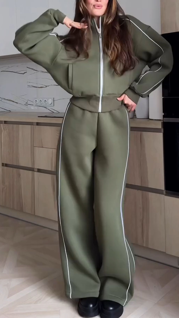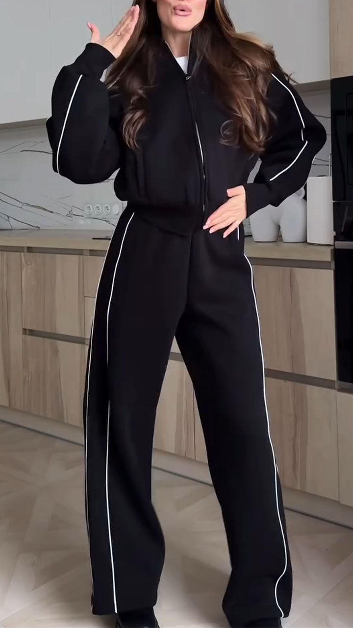 • Women Stand Collar Vertical Stripe Jacket+ Pants Casual Suit