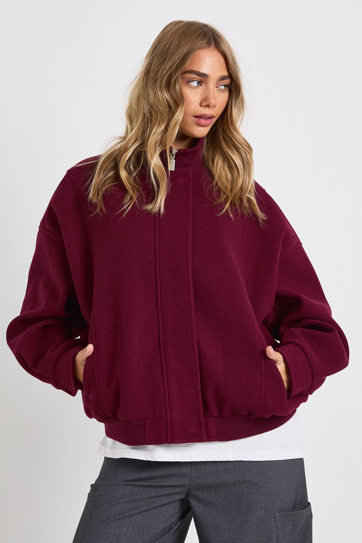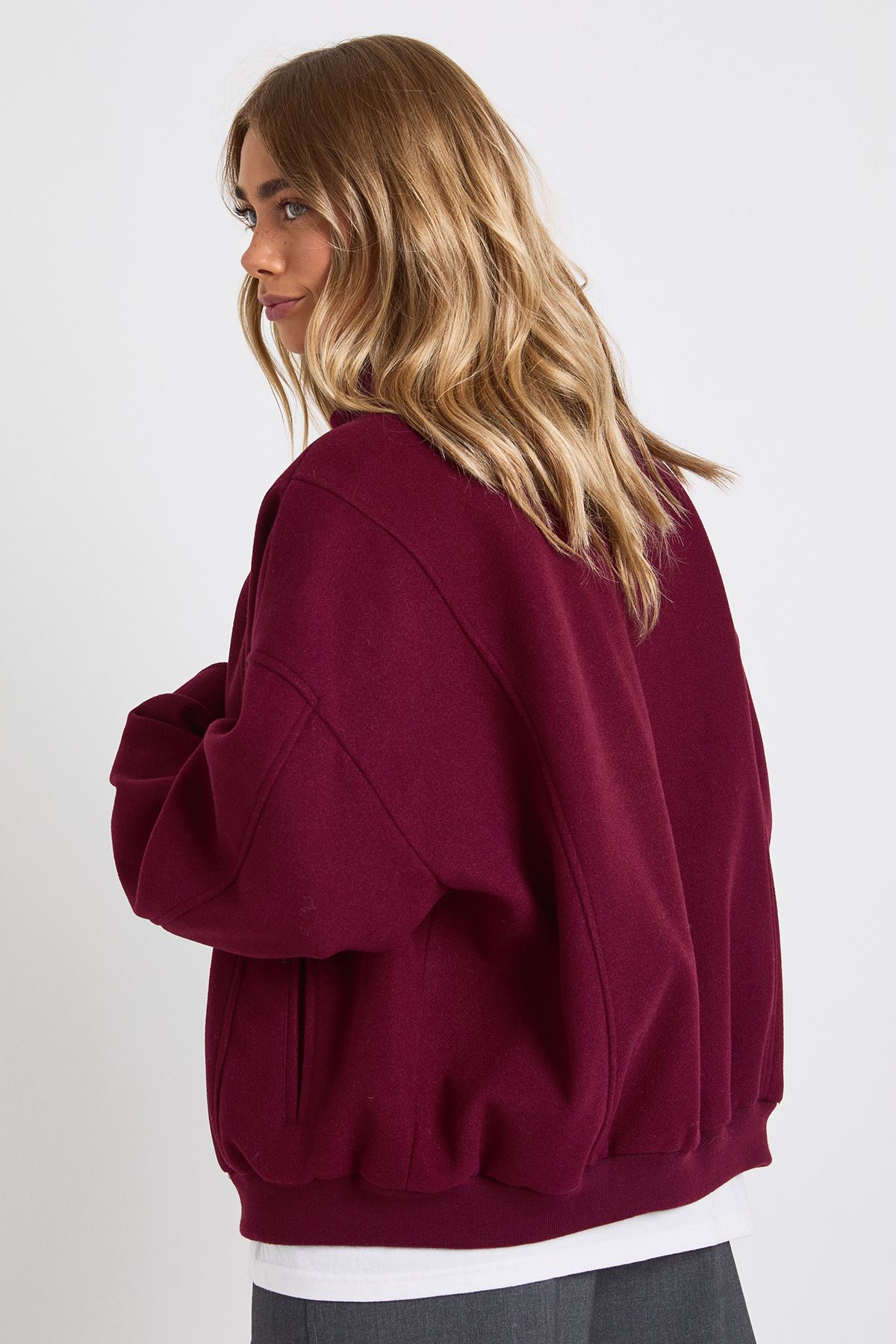 - This wool-look bomber jacket combines timeless appeal with modern proportions, creating the perfect casual statement piece. The relaxed, oversized silhouette offers both comfort and on-trend styling, while the rich texture adds depth to your everyday wardrobe. Style with wide-leg trousers and trainers for a contemporary daytime look, or layer over a simple white tee and jeans for effortless weekend style. For cooler days, pair with a baseball cap and chunky knit for added warmth without compromising on style. Perfect for family gatherings, casual coffee dates or weekend shopping trips, this versatile bomber works across seasons and occasions. The easy-to-wear design makes it an essential addition to your casual collection, offering that perfect finishing touch to countless outfits.
