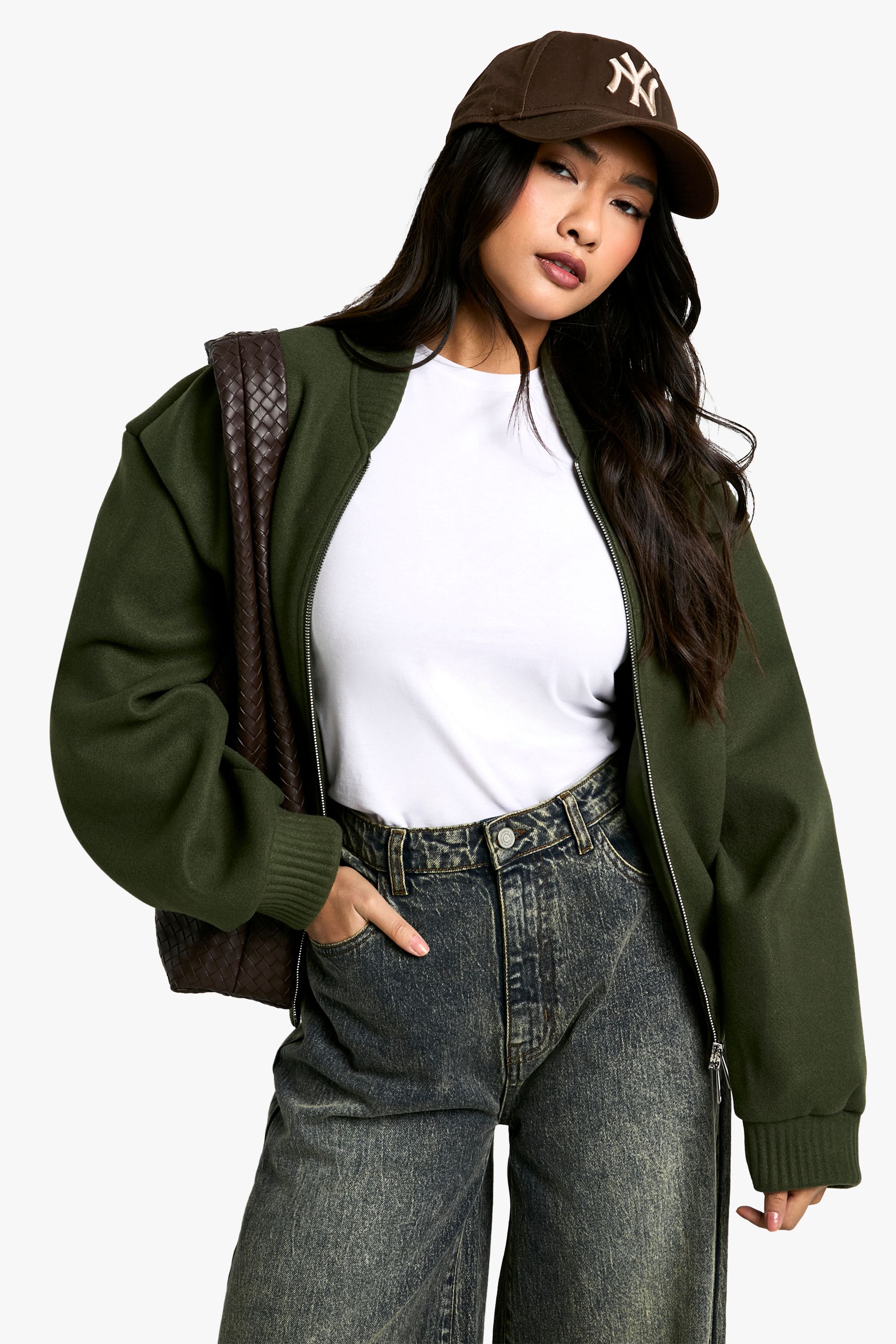 - This Boohoo bomber jacket in wool-look fabric combines comfort with street-style edge. Perfect for the fashion-forward woman who values both style and practicality, this jacket is a versatile addition to any wardrobe. Style it with high-waisted jeans and a simple white tee for a casual daytime look, or throw it over a midi dress and trainers for an effortless evening ensemble. The oversized fit allows for easy layering, making it ideal for unpredictable British weather. Whether you're heading to a casual lunch with friends or a laid-back night out, this bomber jacket will keep you looking cool and feeling snug. Its timeless design ensures it will remain a go-to piece in your wardrobe for seasons to come.