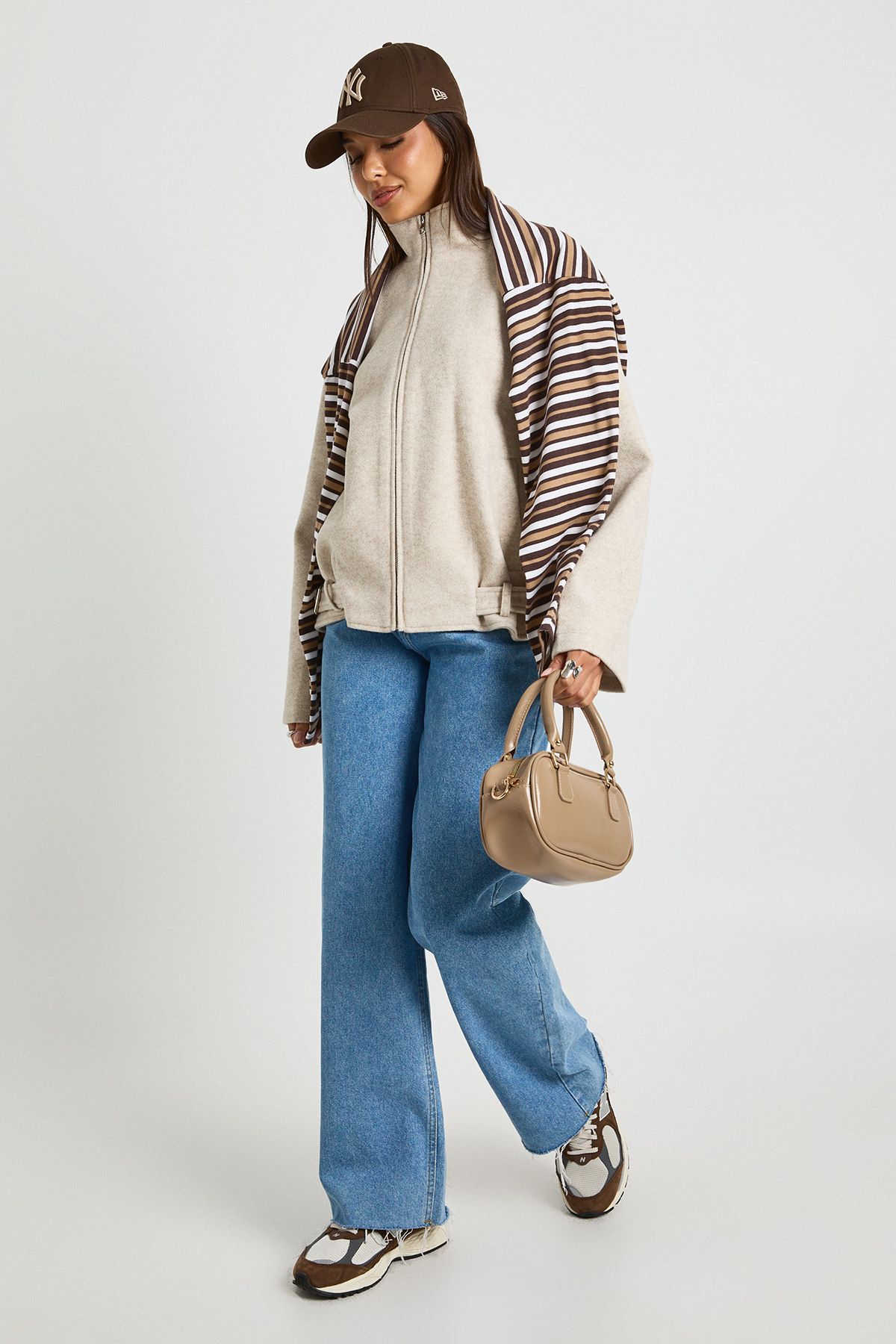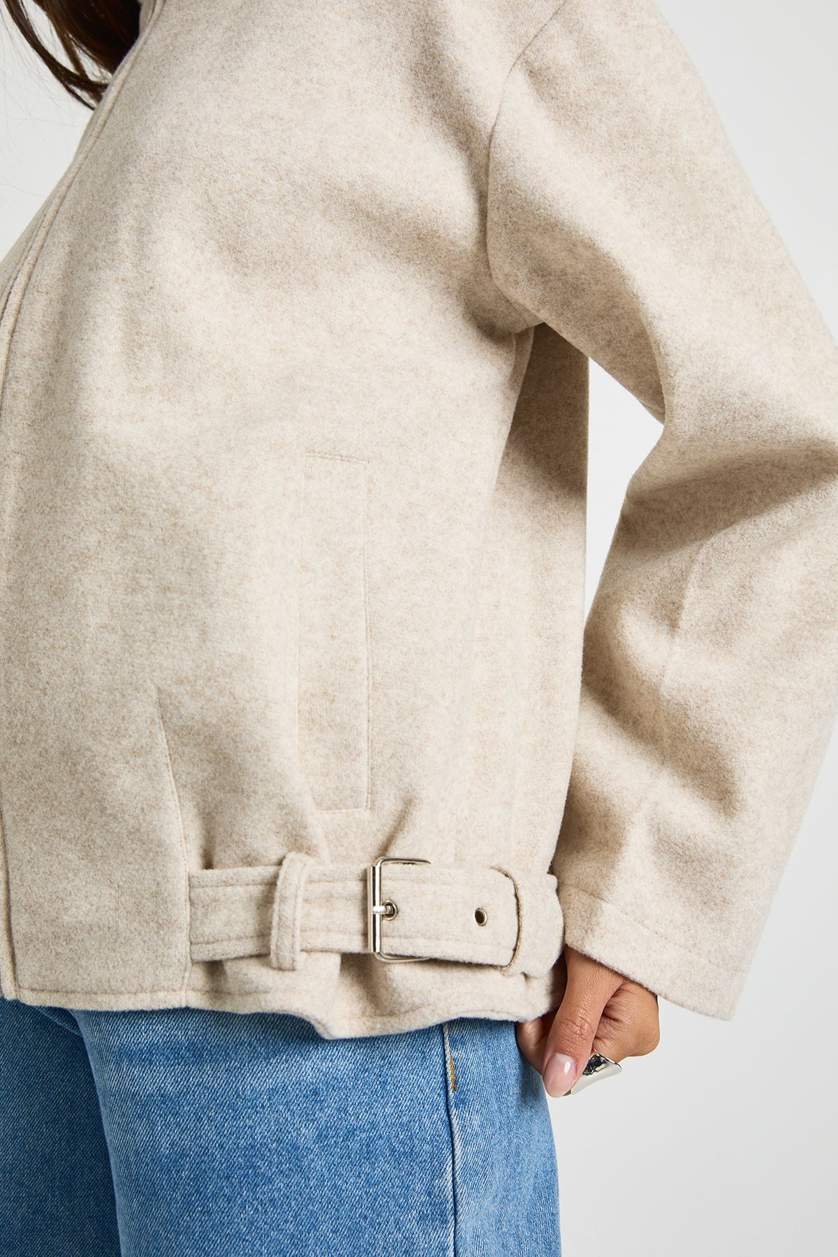 - This Boohoo Wool Look Buckle Detail Jacket combines contemporary style with practical design. The structured silhouette features distinctive side buckles that allow you to customise the fit whilst adding visual interest to this casual staple. Style it as seen with relaxed denim jeans and trainers for everyday outings, or layer over a fitted dress with ankle boots for family gatherings. The high neck provides extra warmth during cooler months, while the zip-through front offers versatility in styling. For a fashion-forward look, try layering with a striped oversized scarf as shown, and complete your ensemble with a cap and mini handbag for an effortlessly cool weekend outfit. This jacket works brilliantly as a transitional piece that can be worn throughout multiple seasons, making it a valuable addition to your casual wardrobe.