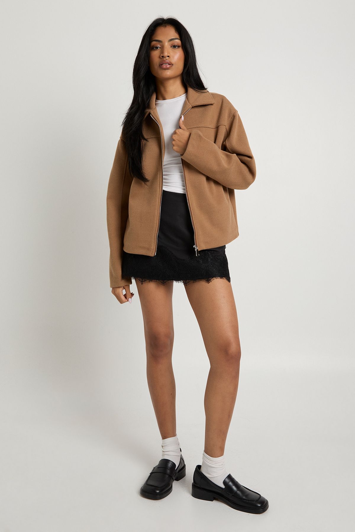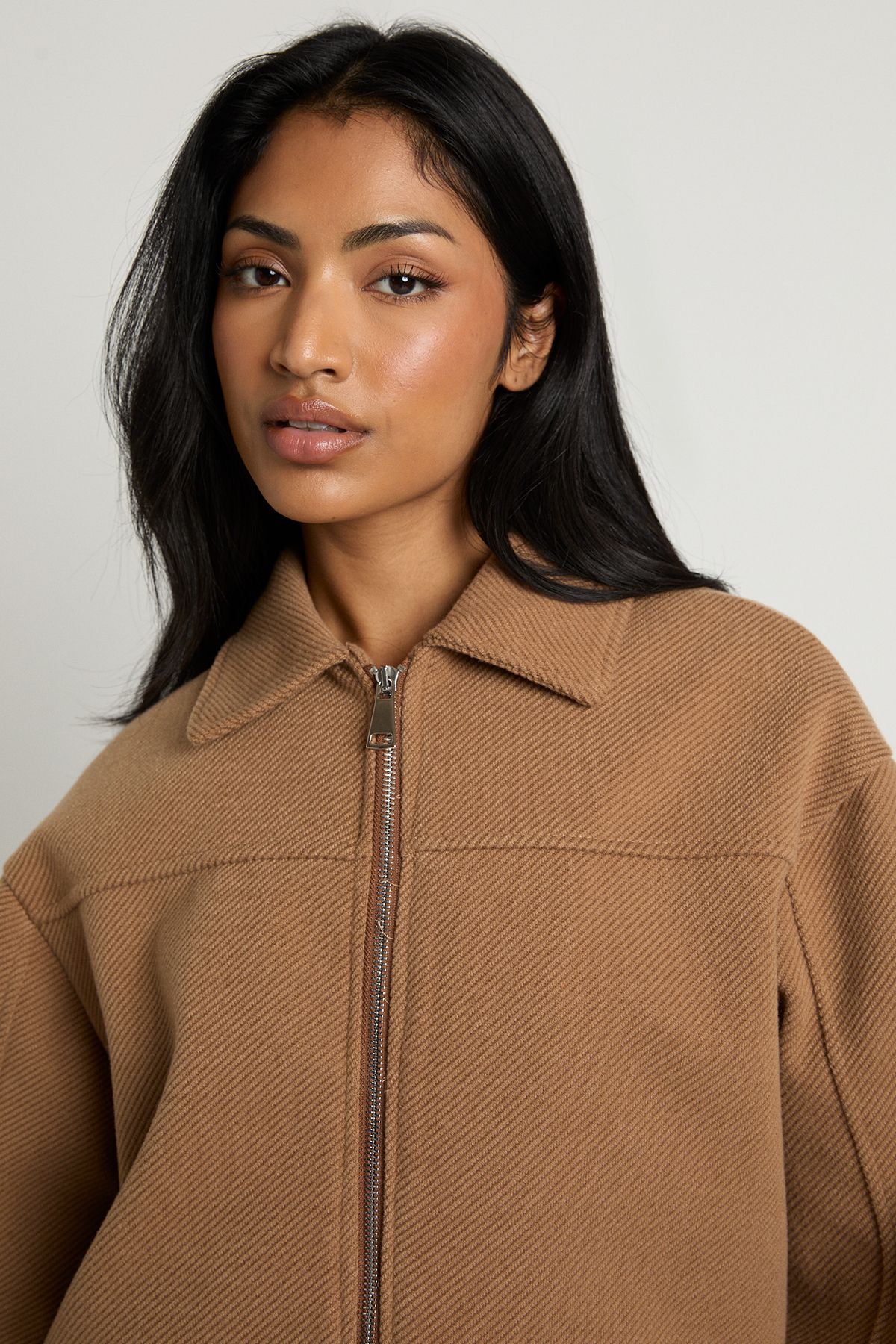 - This wool-look zip collar jacket combines timeless style with modern versatility. The structured silhouette creates a polished appearance whilst maintaining a relaxed feel that works brilliantly for everyday wear. Style with a simple white tee and a lace-trimmed mini skirt for an effortless day-to-night look, or pair with straight-leg jeans and trainers for weekend coffee dates. The jacket's clean lines and unfussy design make it an ideal companion for autumn strolls or casual family gatherings. Its adaptable nature means you can dress it up with boots and statement jewellery or keep things laid-back with leggings and a crossbody bag. A true wardrobe staple that transitions seamlessly between seasons, this jacket offers the perfect balance of comfort and style for the fashion-forward woman who values versatility in her everyday wardrobe.
