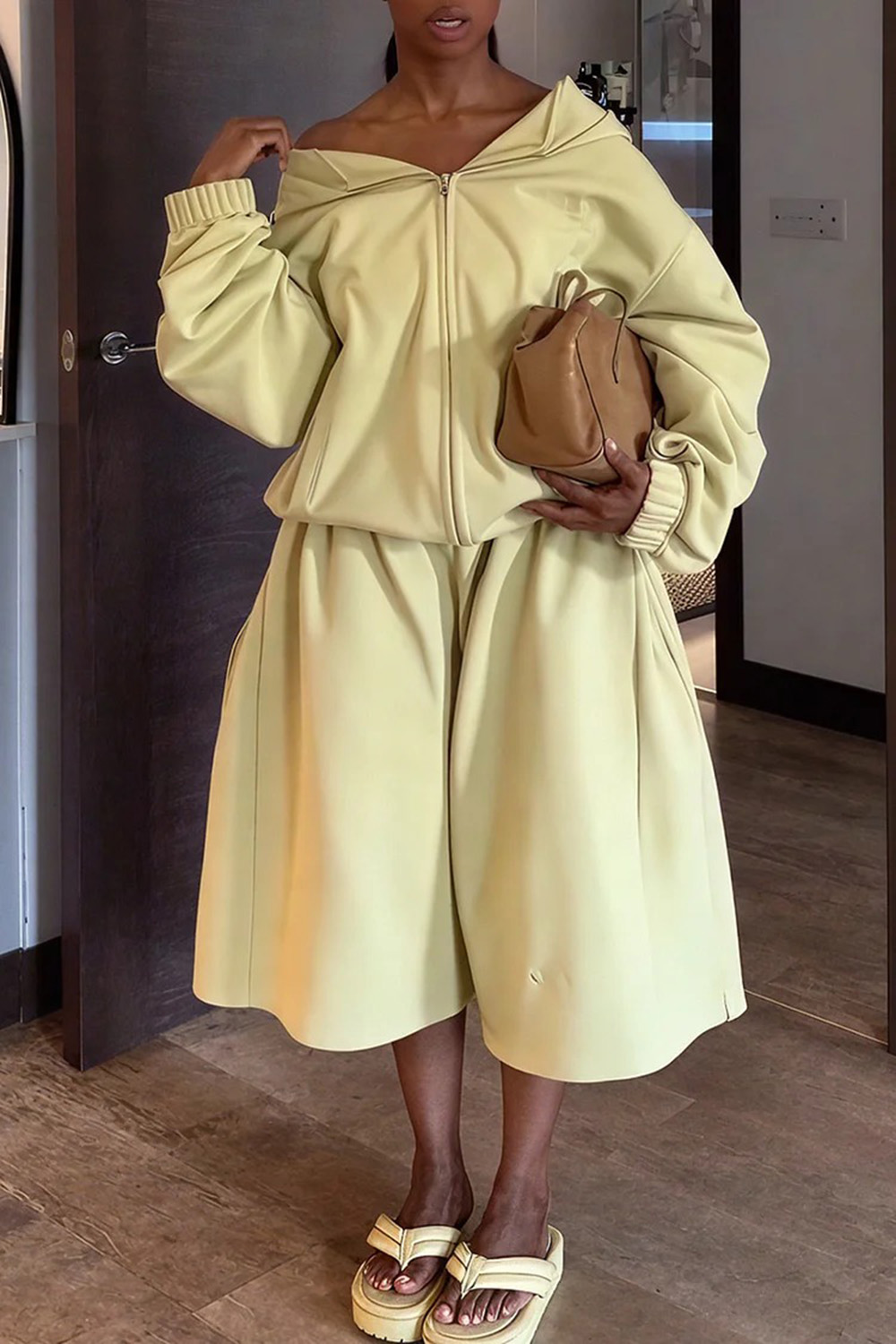 • Zip-Up Hoodie Jacket Crop Wide Leg Pants Casual 2pcs Set-Yellow