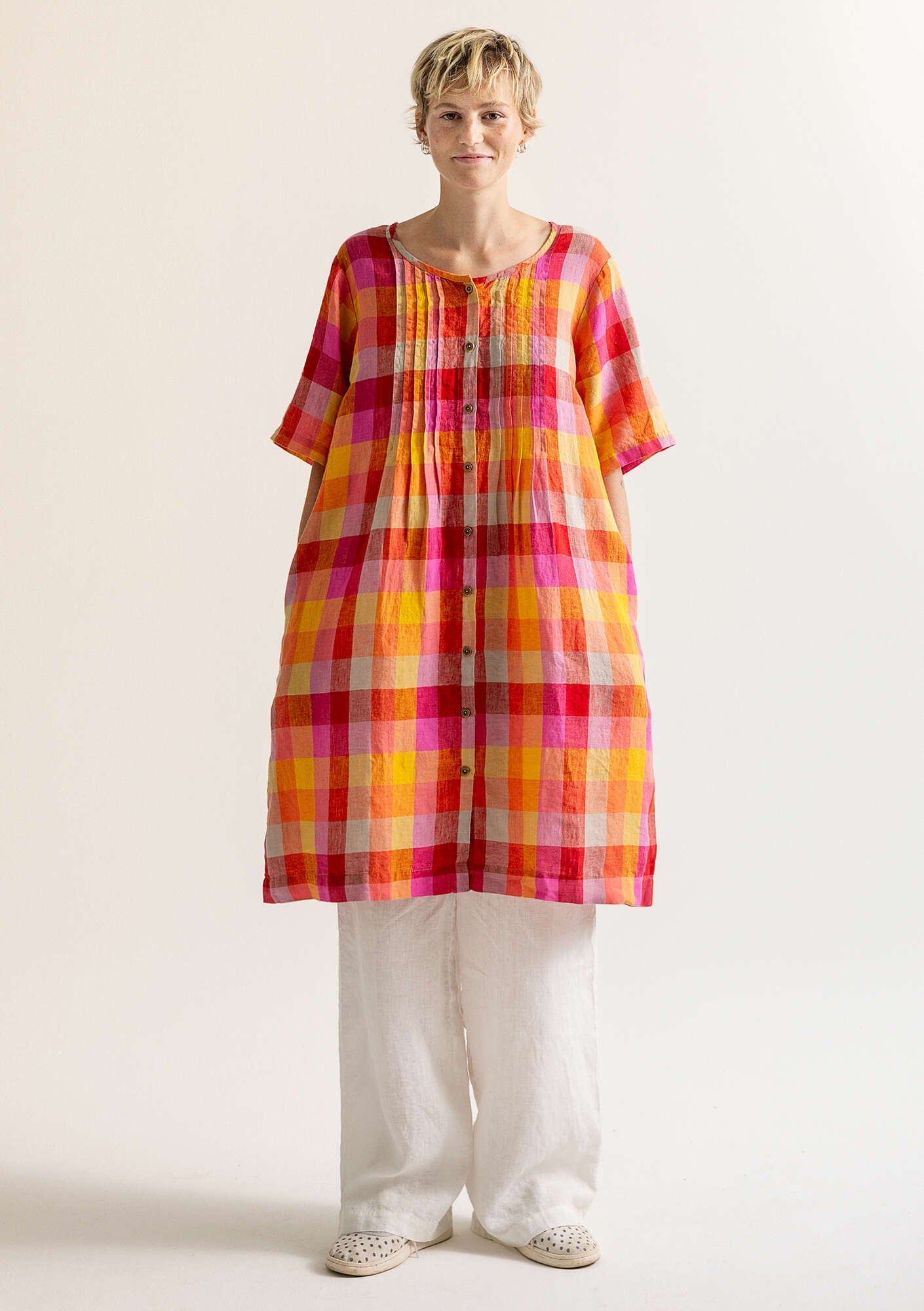 • Button-through dress with front and back vertical pleats. Elbow-length sleeves and side pockets. Choice of solid colours, a checked pattern and a chambray weave.