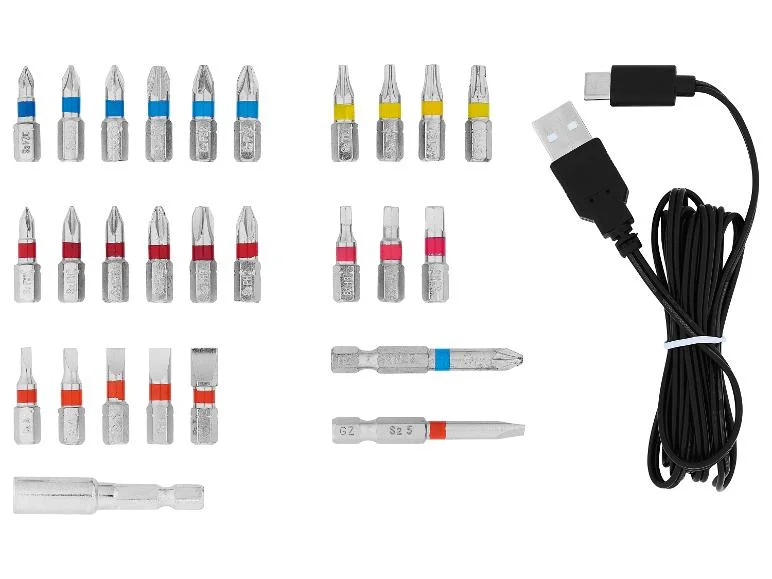| Accessoires: | 26 embouts de vissage, 1 porte-embout magnétique, 1 câble de charge USB-C vers USB-A (1,5 m) |