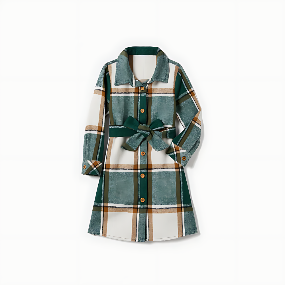 - Design: Matching plaid shirts and belted dresses for the family.
