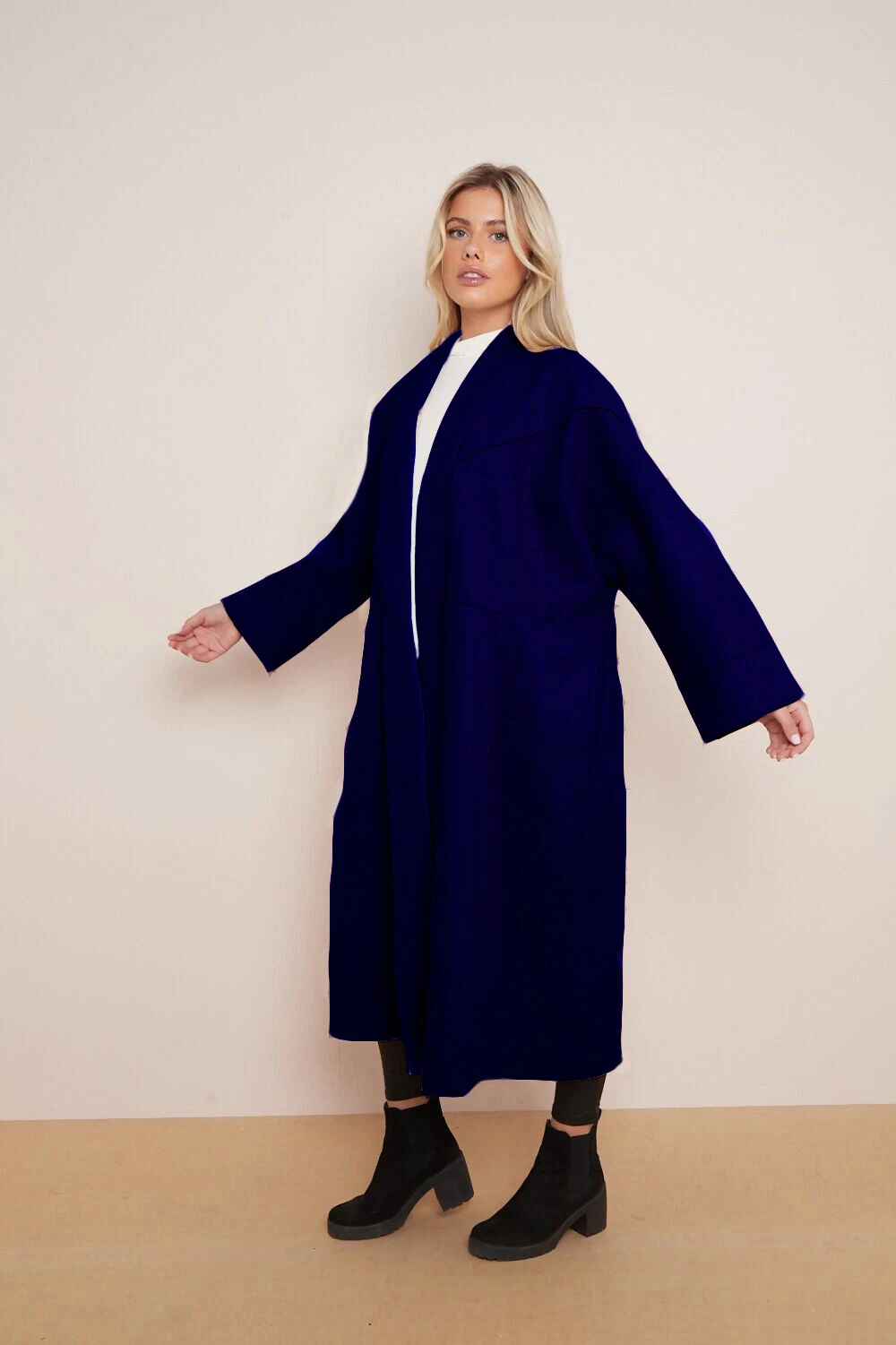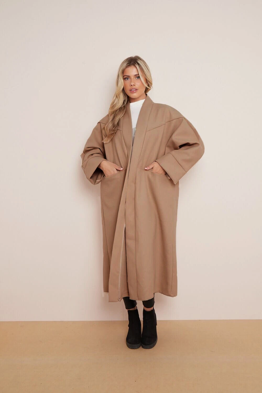 • Solid Color Exposed Stitches Pocket Oversize Thermal Coat, Plain Winter Open-Front Outerwear Jacket,Basic Womenswear