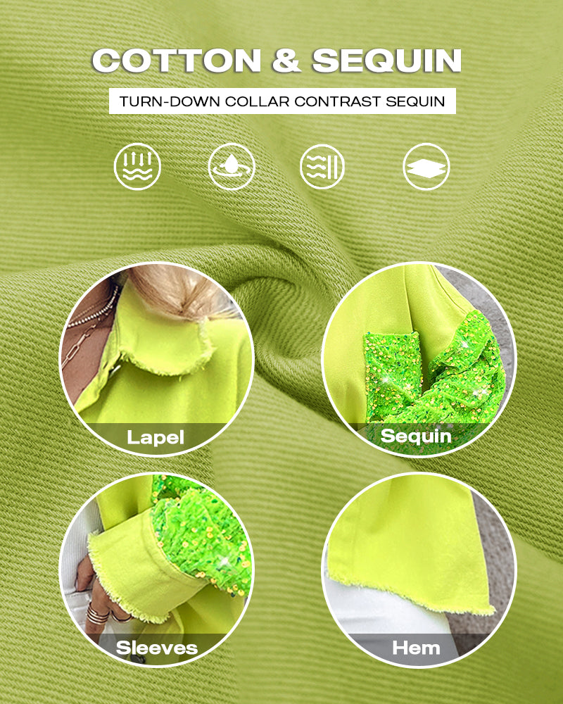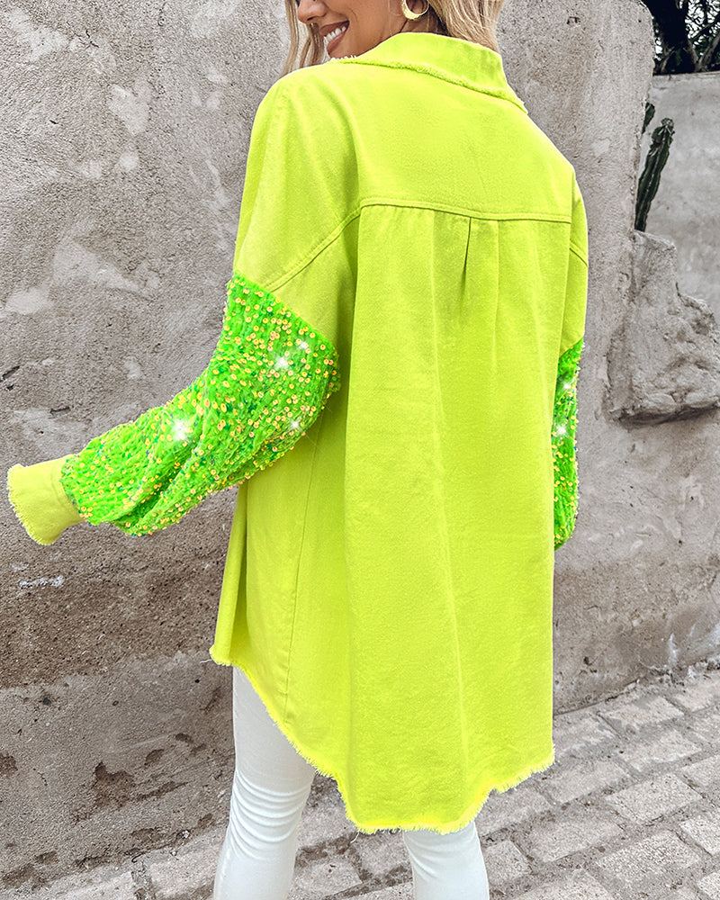 Feature Details: This casual jacket features oversized cut,�raw trim,�turn-down collar, button down closure, mesh and sequin spliced long sleeves, sequin pockets, high-Low hem.