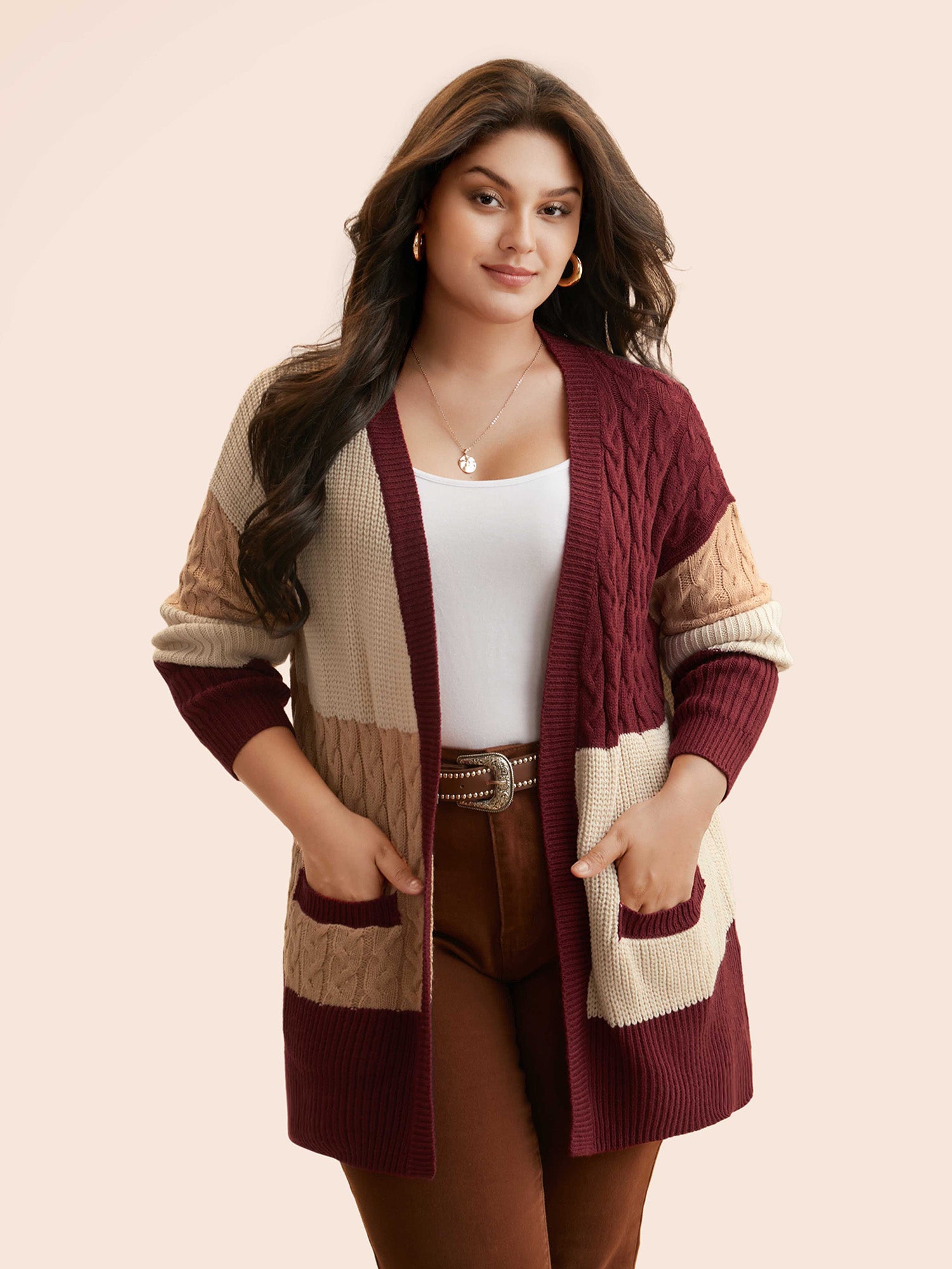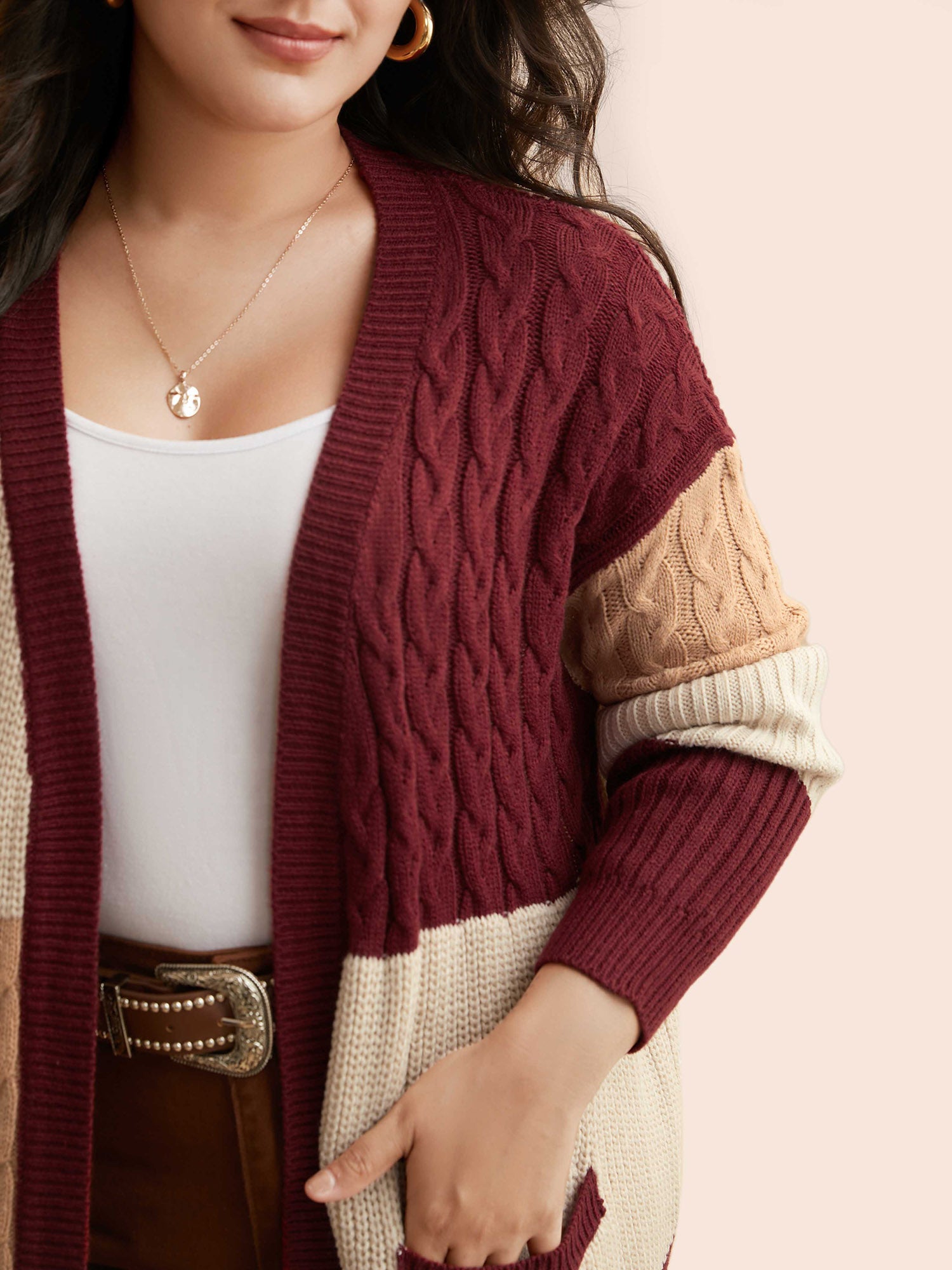 Shop Colorblock Contrast Cable Knit Pocket Cardigan now and redefine your style with confidence at BloomChic. Tailored for mid and plus-size women. This trendy Sweaters Cardigans Women, sizes 10-30. Season:Winter;Color:Maroon;Style:Casual;Neckline:Kimono collar;Sleeve Type:Drop shoulder sleeve;Prints:Geometric & color block;Details:Contrast, Cable Knit, Texture;Pocket:Patch pocket;Belt:No-belt;Closure Type:Open front without closure