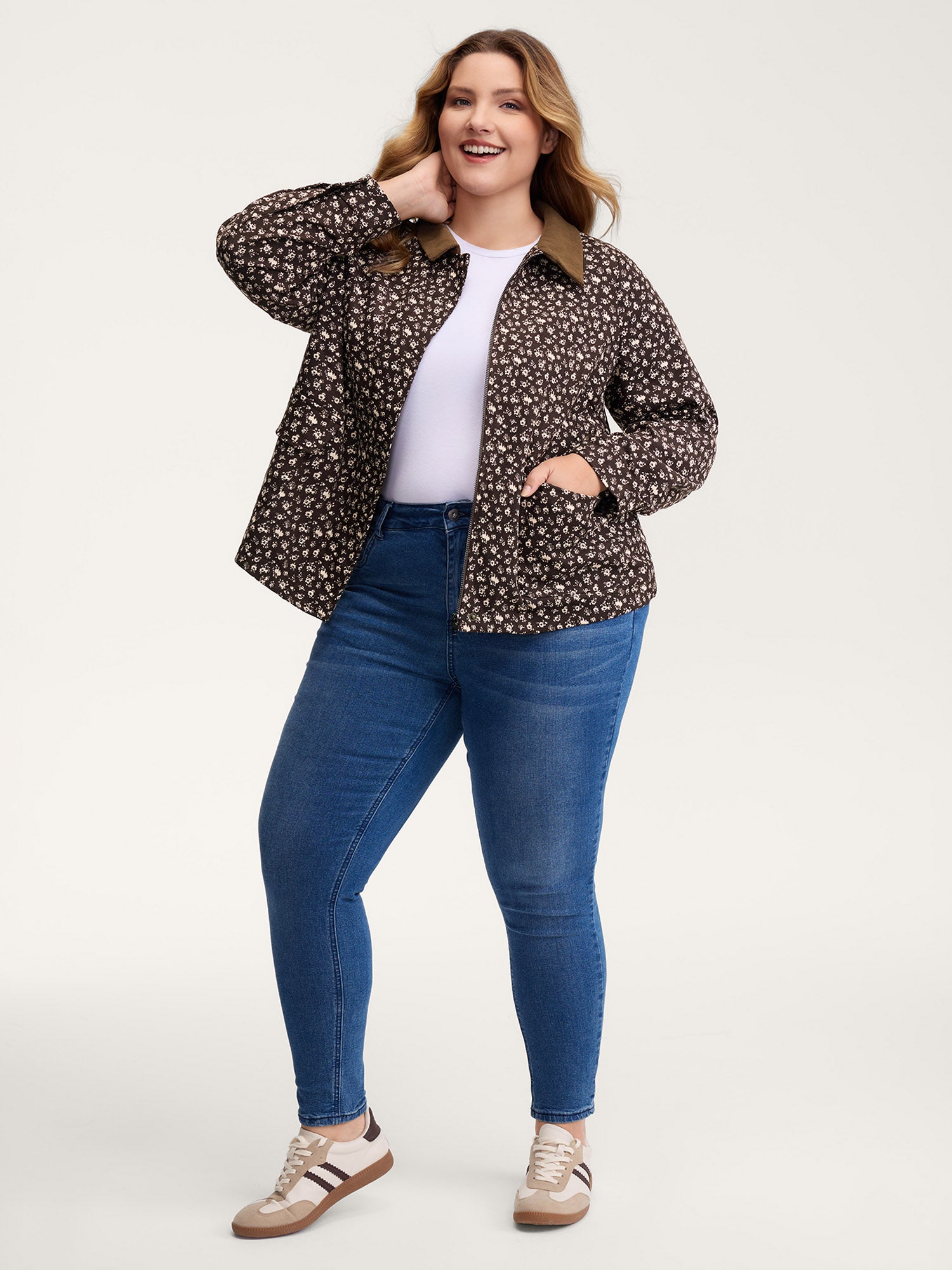 Shop Floral Print Contrast Collar Jacket now and redefine your style with confidence at BloomChic. Tailored for mid and plus-size women. This trendy Outerwear Women, sizes 10-30. Color:Browncoffeecolor;Prints:Ditsy floral;Details:Contrast;Pocket:Open pocket with flap;Belt:No-belt;Closure Type:Zipper;Lining:Lining