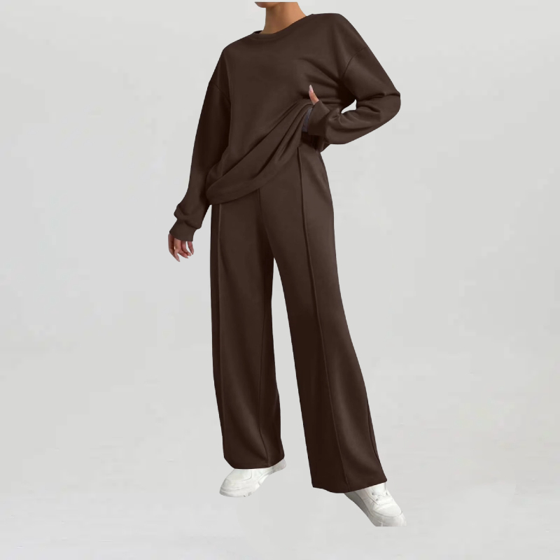 • Women's Casual Solid Color Loose Long Sleeve Top & Exposed Stitches Trousers Co-ord, Cozy Round Neck Top & Wide Leg Trousers Two Piece Outfits