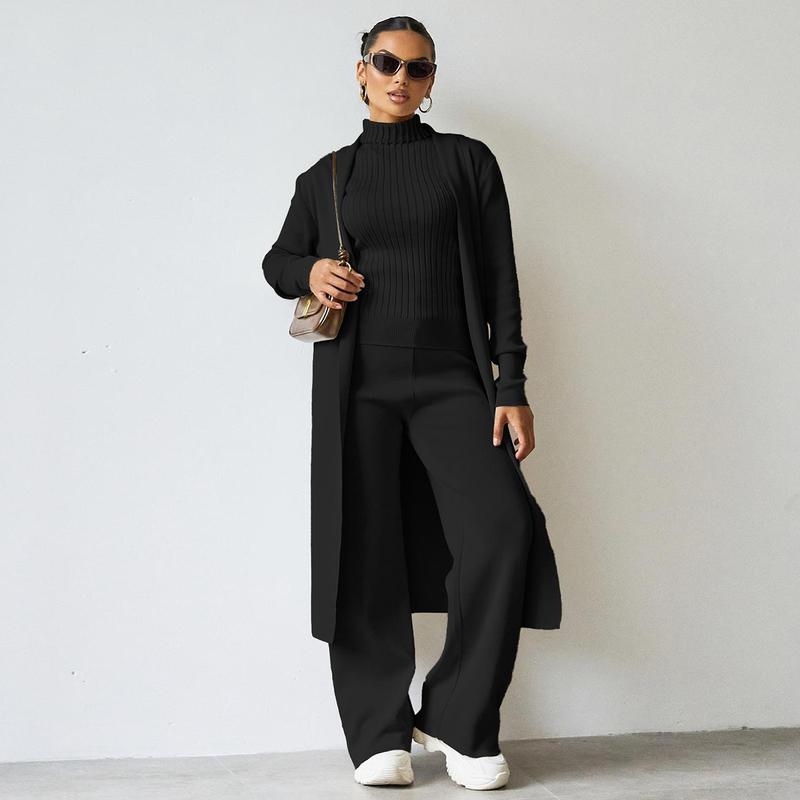 • Women's Three-Piece Set Solid Turtle Neck Tank Top & Wide Leg Trousers & Open Front Long Cardigan Set, Women Clothes for Fall & Winter