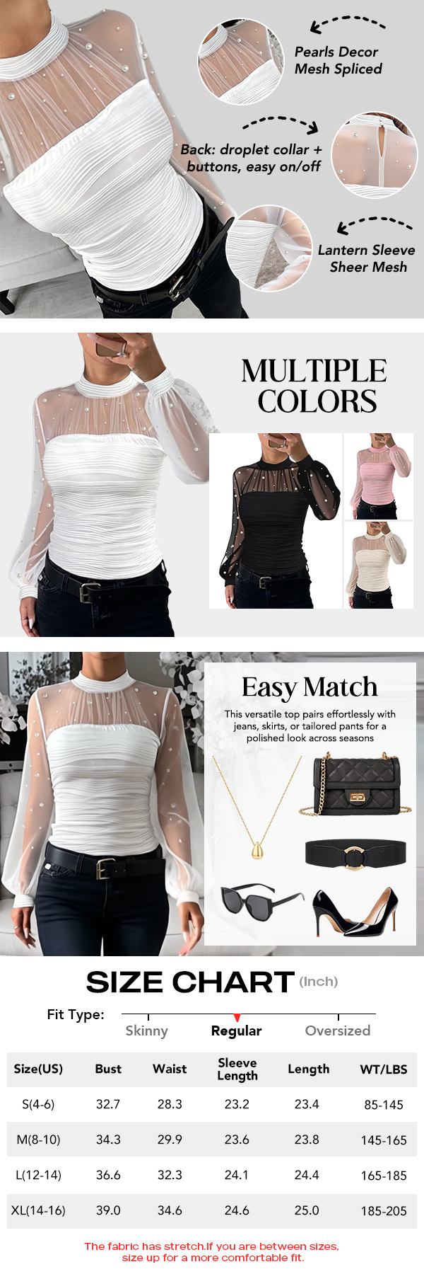 Design Details �� Sheer mesh upper and sleeves adorned with pearl accents, contrasted with ruched and textured bodice and hollow-out back with button closure.