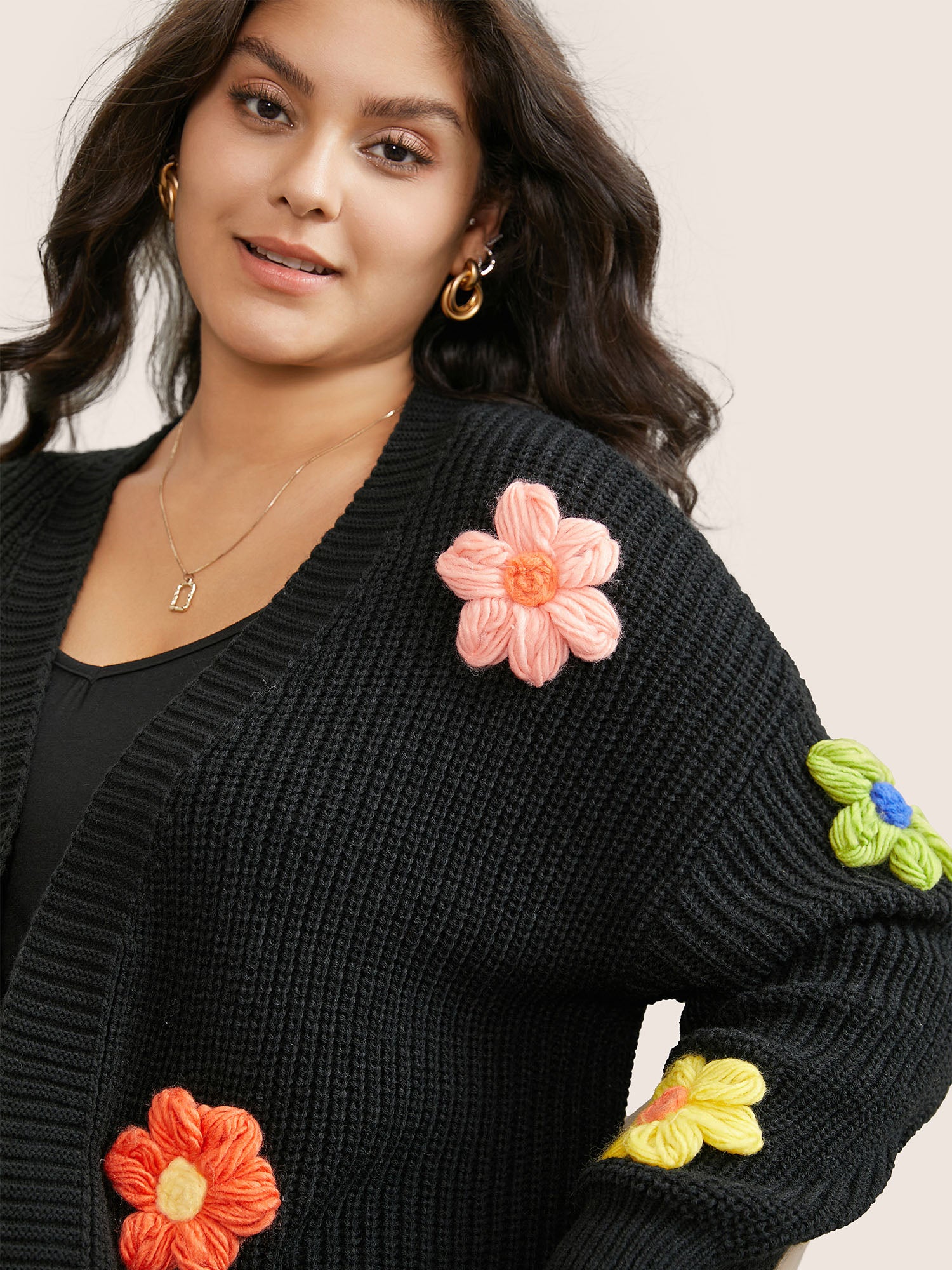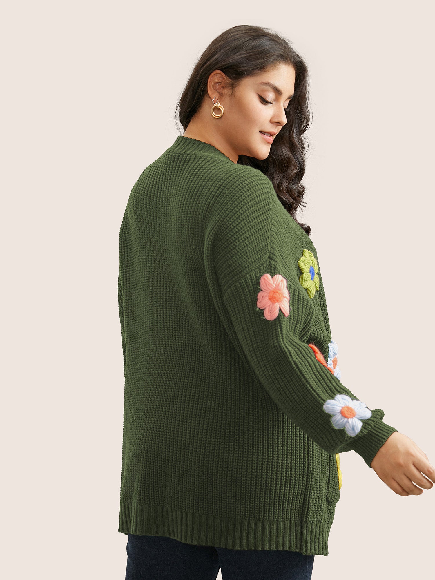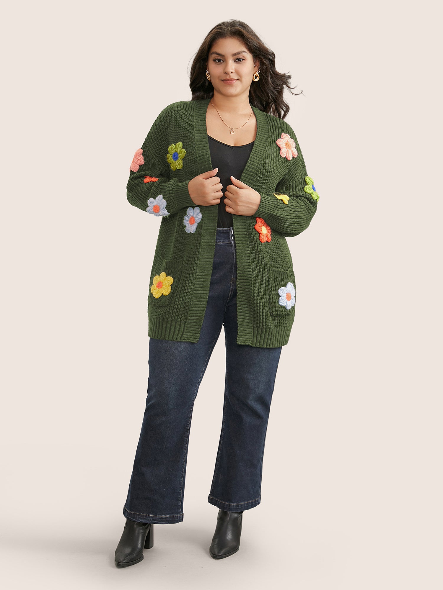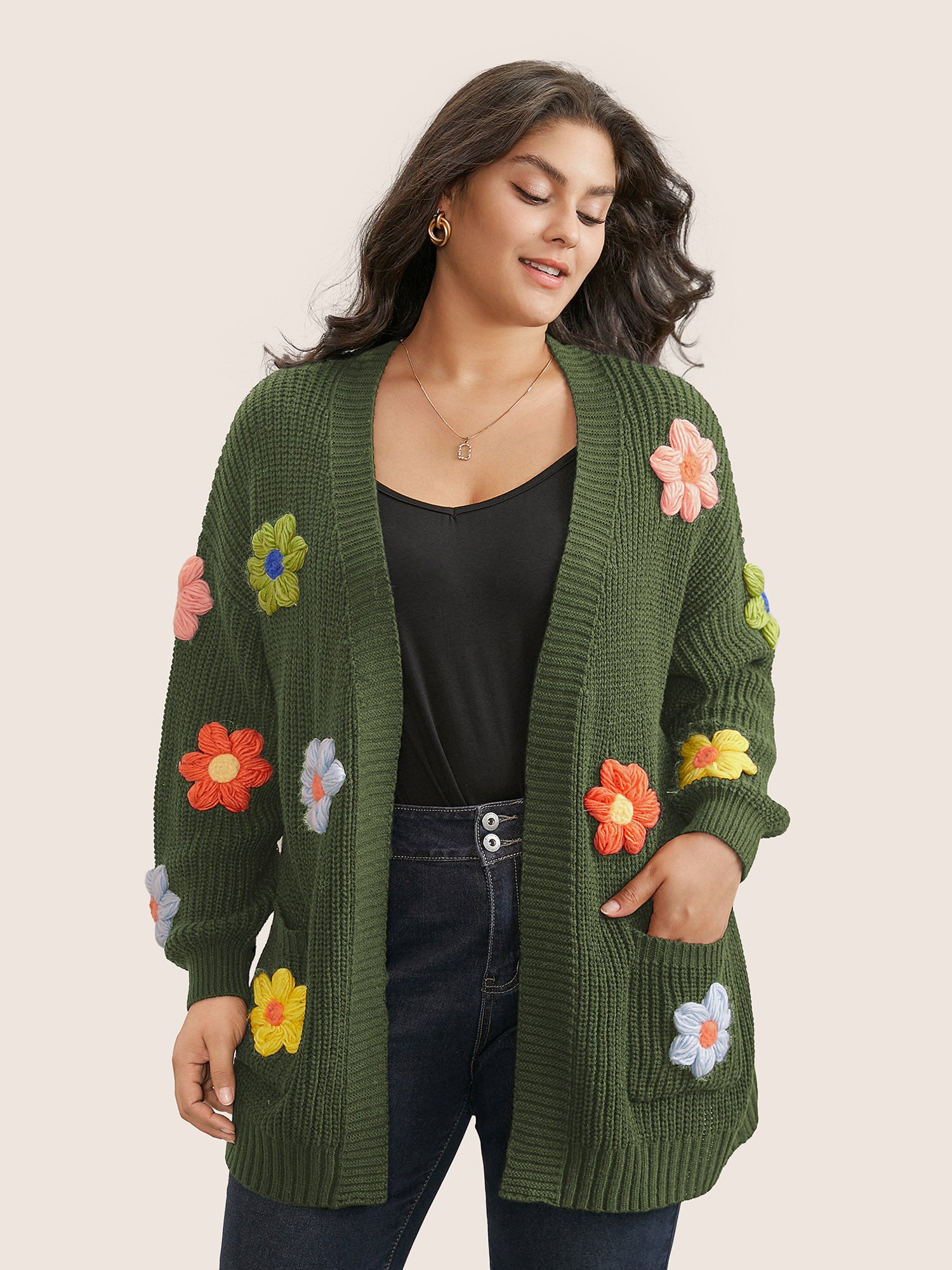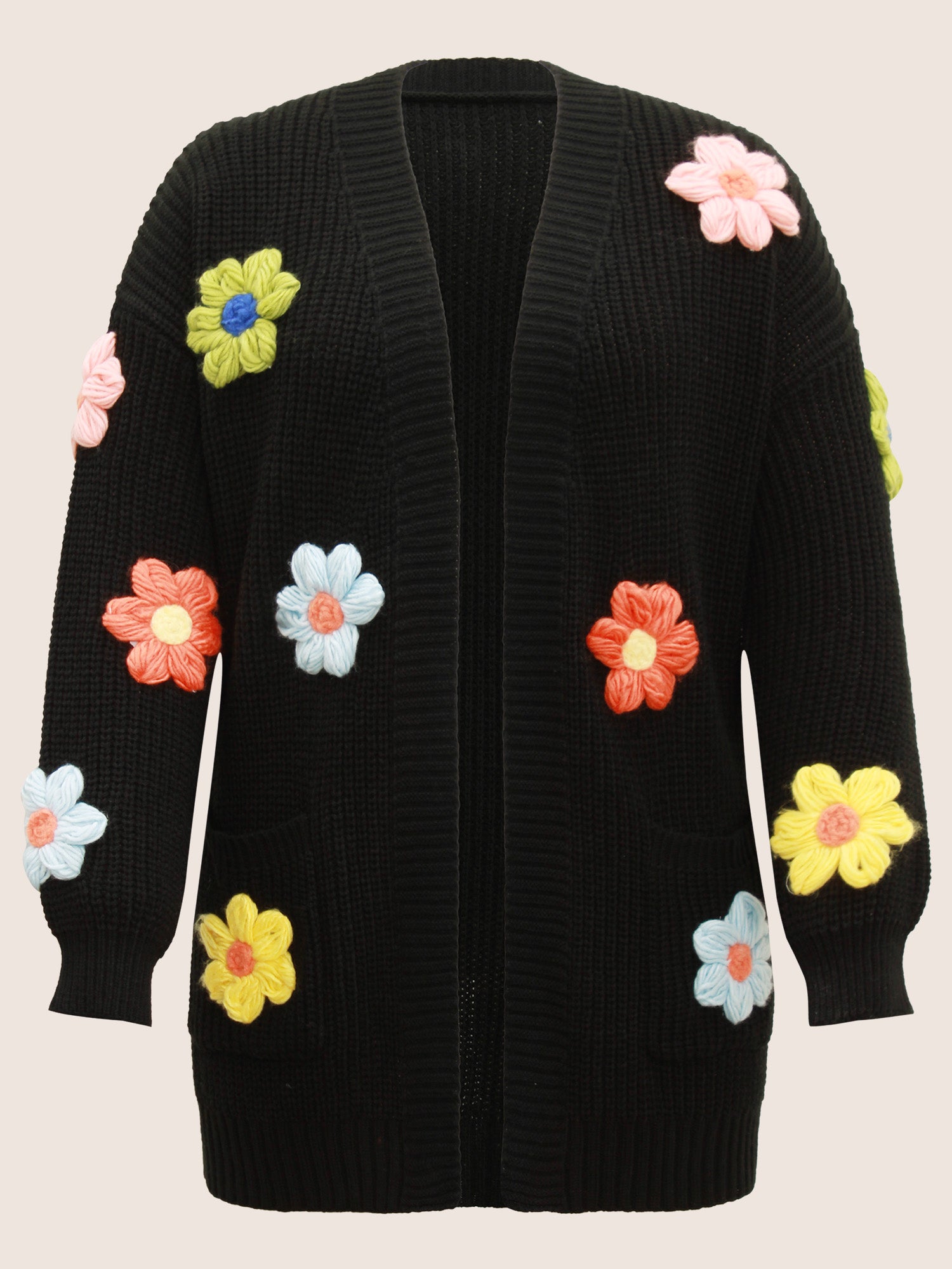 Shop Rainbow Floral Pocket Open Front Cardigan now and redefine your style with confidence at BloomChic. Tailored for mid and plus-size women. This trendy Sweaters Cardigans Women, sizes 10-30. Color:Black,ArmyGreen;Neckline:Kimono collar;Sleeve Type:Regular Sleeve;Pattern Type:Floral;Pocket:Slanted pocket;Belt:No-belt