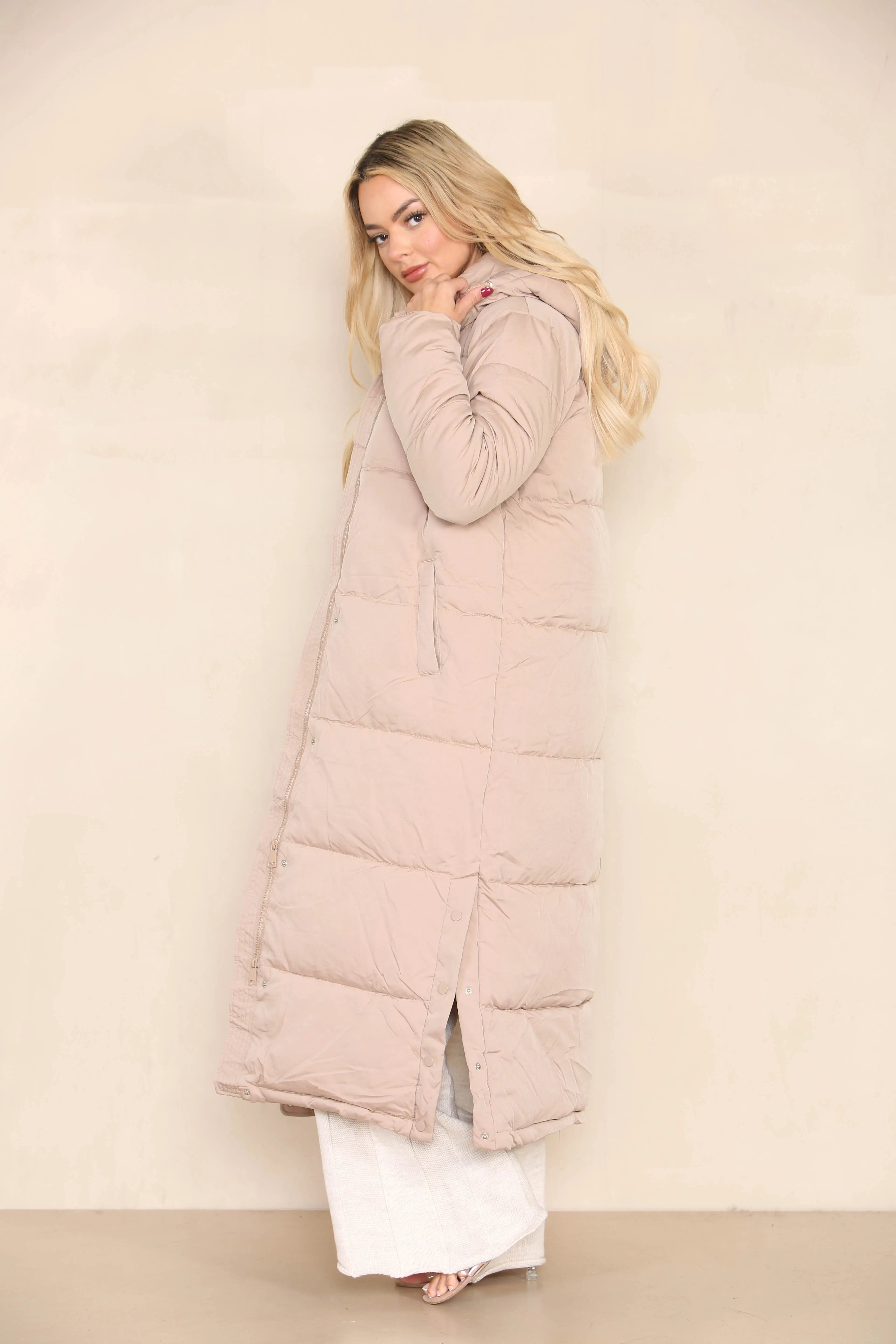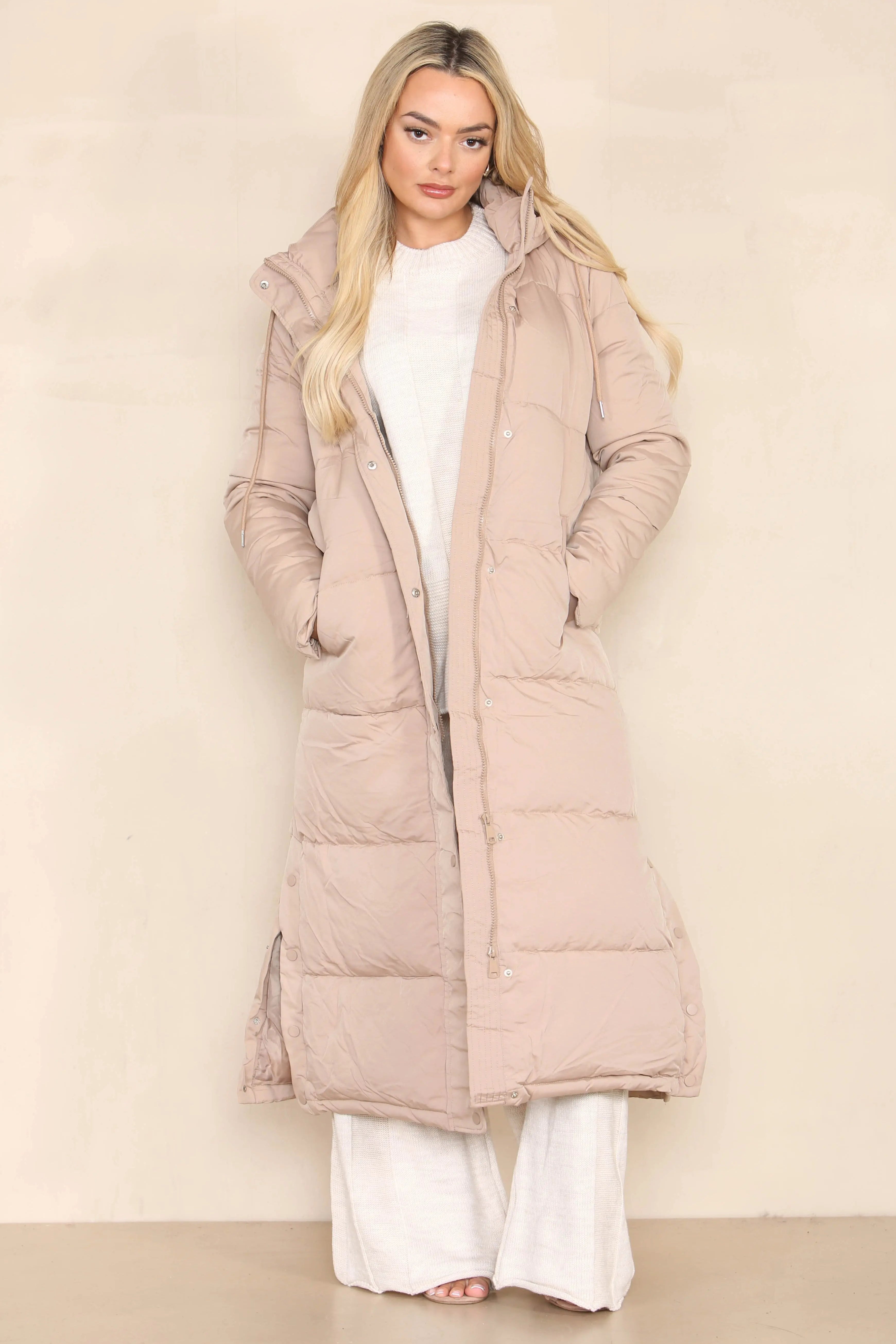 This exquisite coat features long, elegant sleeves and a cozy back hood adorned with a practical drawstring. Get ready to step out in confidence and comfort!