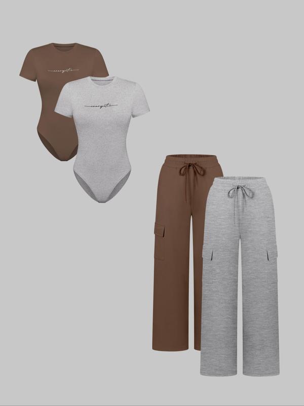 Women's Knit Letter Print Jumpsuit Set, Casual Fitted Short Sleeve Tee & Long Pants, All Seasons Fashion